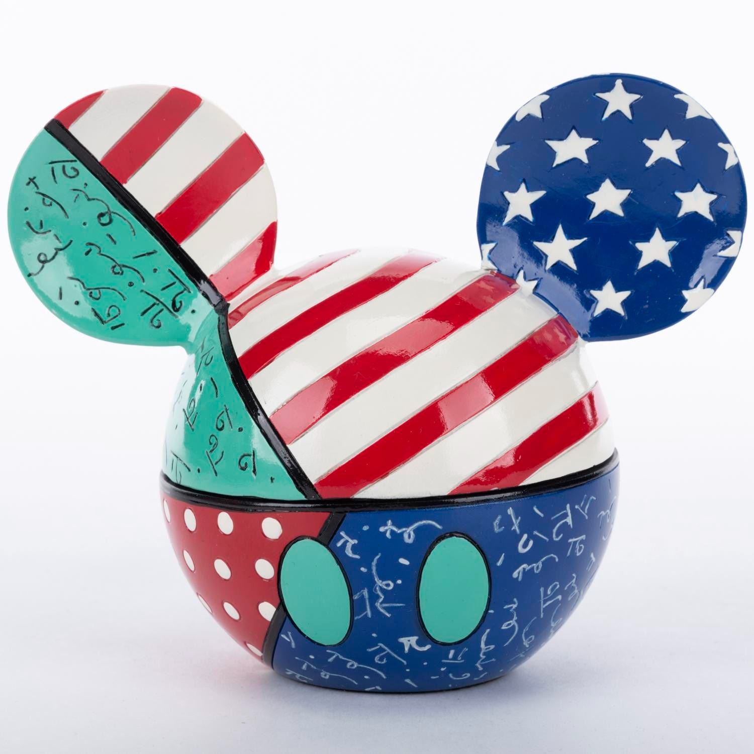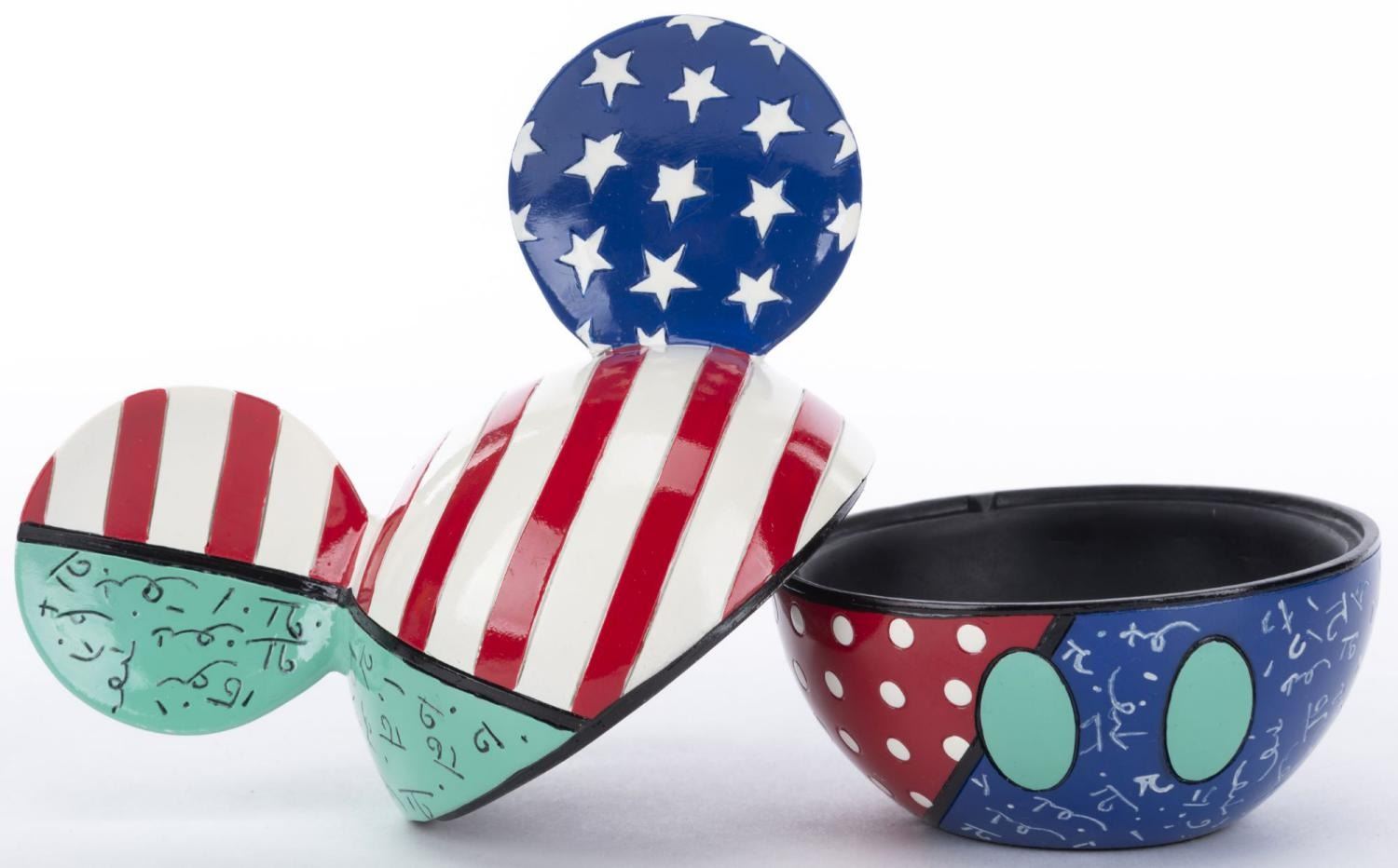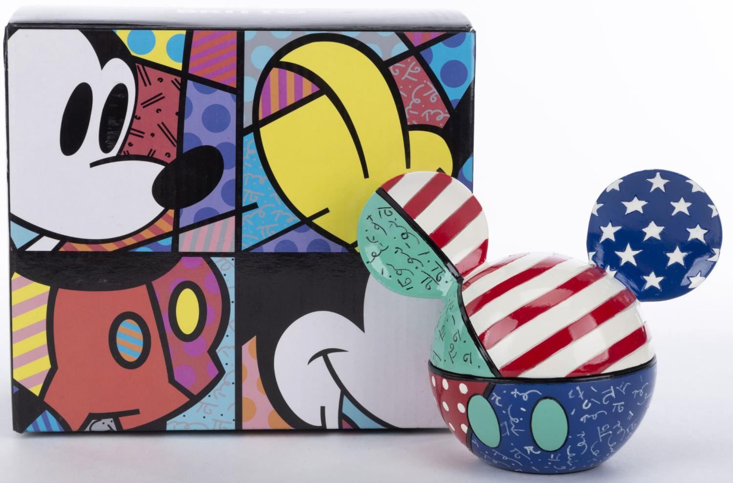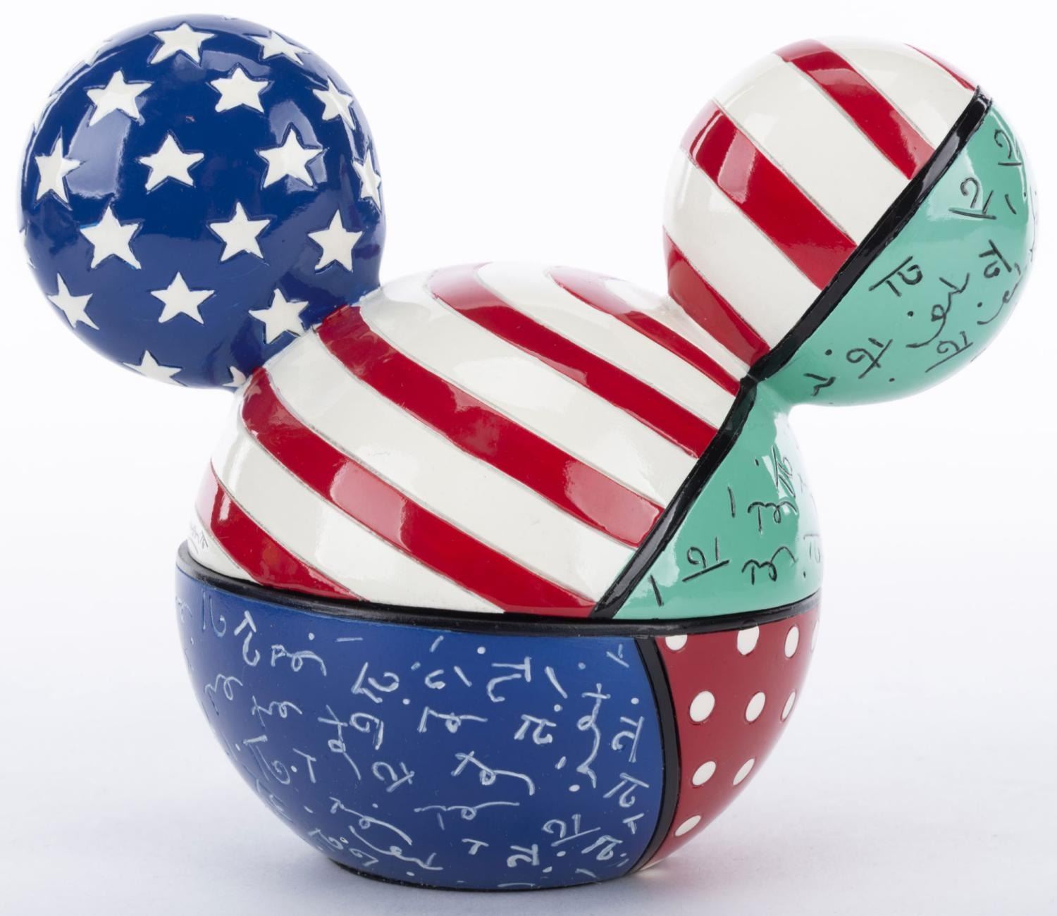 (Britto, 2010) A patriotic Mickey Mouse trinket box titled"Stars and Stripes" designed by Romero Britto. Measuring 5" x 3.25" and 4.25" tall, the box is in fine condition.