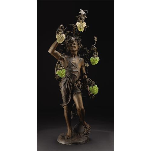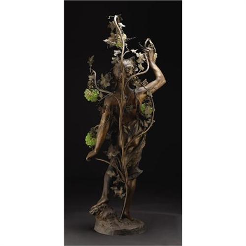<B>A Bronze Figural Standing Lamp</B></I><BR><BR>Unknown maker, French<BR>Late nineteenth/early twentieth century<BR>Bronze and colored glass<BR>Unmarked<BR>56.5 inches high<BR><BR>The standing draped figure of Bacchus intertwined with grape vines and leaves, the pendant grape clusters in green glass framing light sockets. <B>Condition Report:</B> Normal signs of wear as appropriate with age. Dexter arm repaired. One vine detached. Several glass "grapes" missing.<BR><BR><b>Shipping:</b> Requires 3rd Party Shipping (<a target="_blank" href="http://www.heritageauctions.com/common/shipping.php">view shipping information</a>)