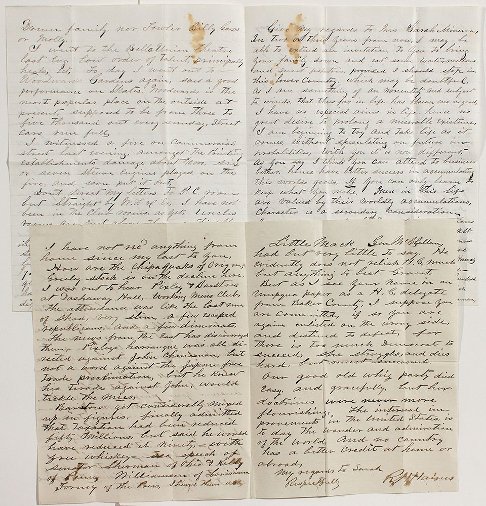 1871 Pay attention all you San Franciscans and collectors of items from that wonderful City. This is a pair of letters from a gentleman, R.H. Haines, to his brother, reporting on the condition of their uncle who is recovering from an un-named illness or malady. It refers to such City landmarks as Woodward’s Gardens, a 19th century combination amusement park, zoo and aquarium. It also mentions The Bella Union Theatre. Haines also mentions bumping into friends and acquaintances while strolling downtown and mentions a friend who is “keeping a cigar stand.”This is a nice slice of life from 1880’s San Francisco and is in great and readable condition inspite of one small stain. Lynn Langdon Collection - HKA#65623