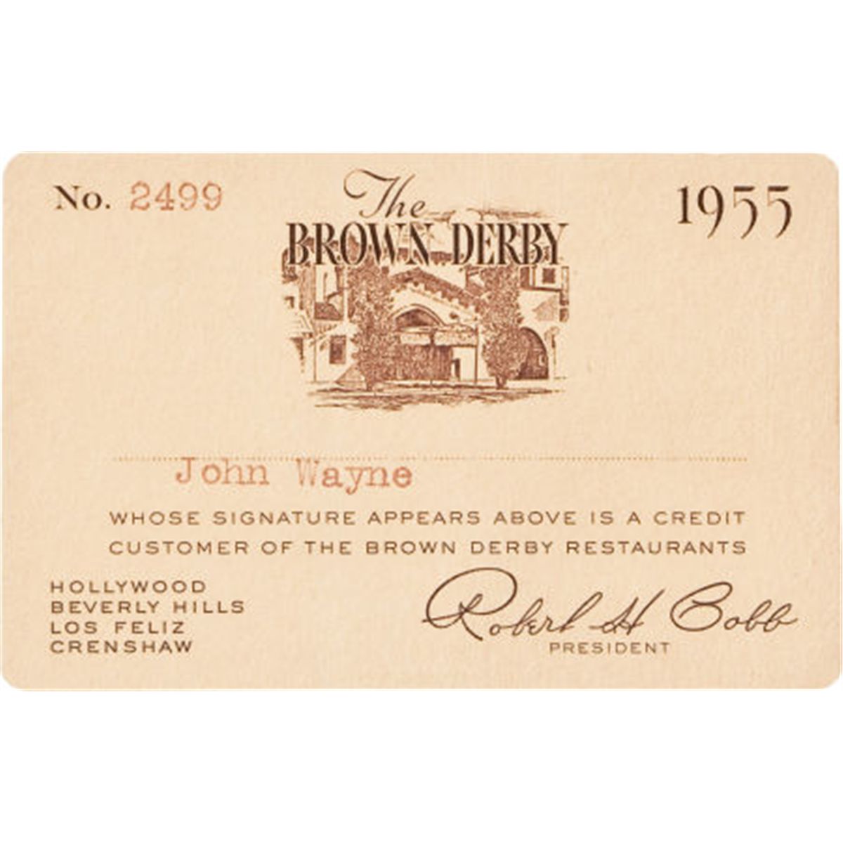 A 'Brown Derby' Membership Card, 1955. With Wayne's typed name on front and the facsimile signature of founder, Robert H. Cobb [inventor of the Cobb Salad], printed below; evidently a "credit card" issued for use at the four different locations of this most famous Hollywood restaurant chain.2" x 3 1/2"
