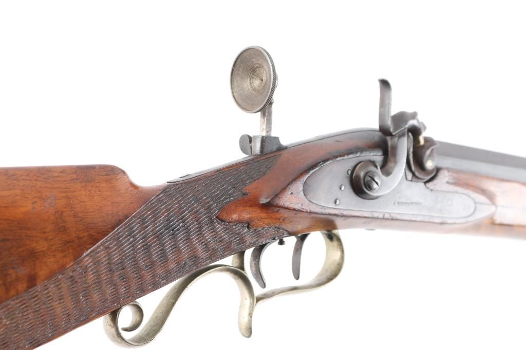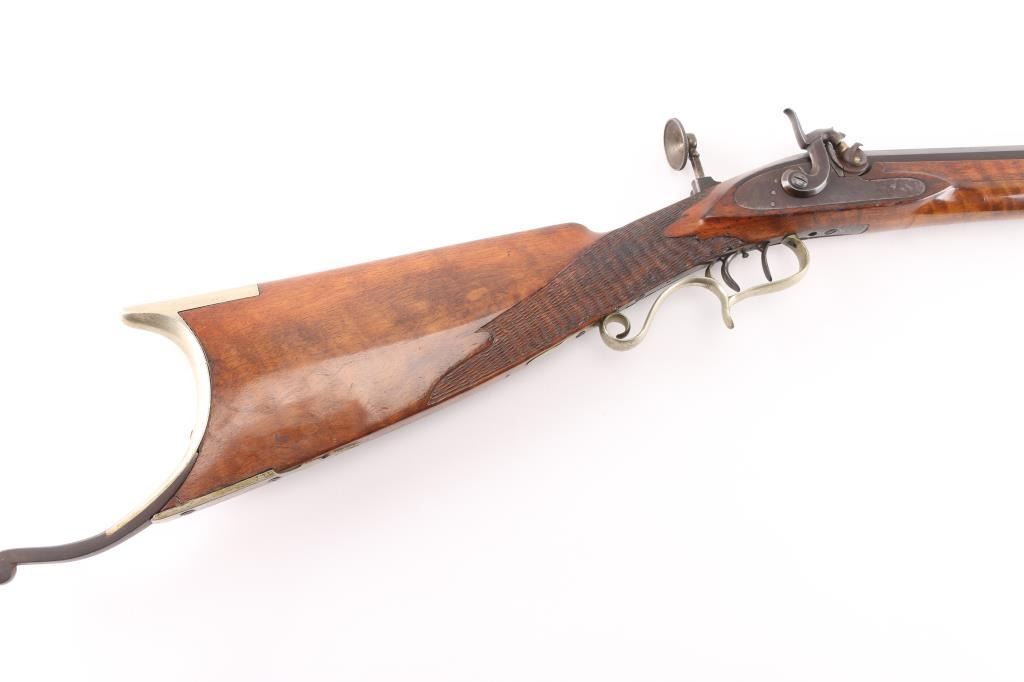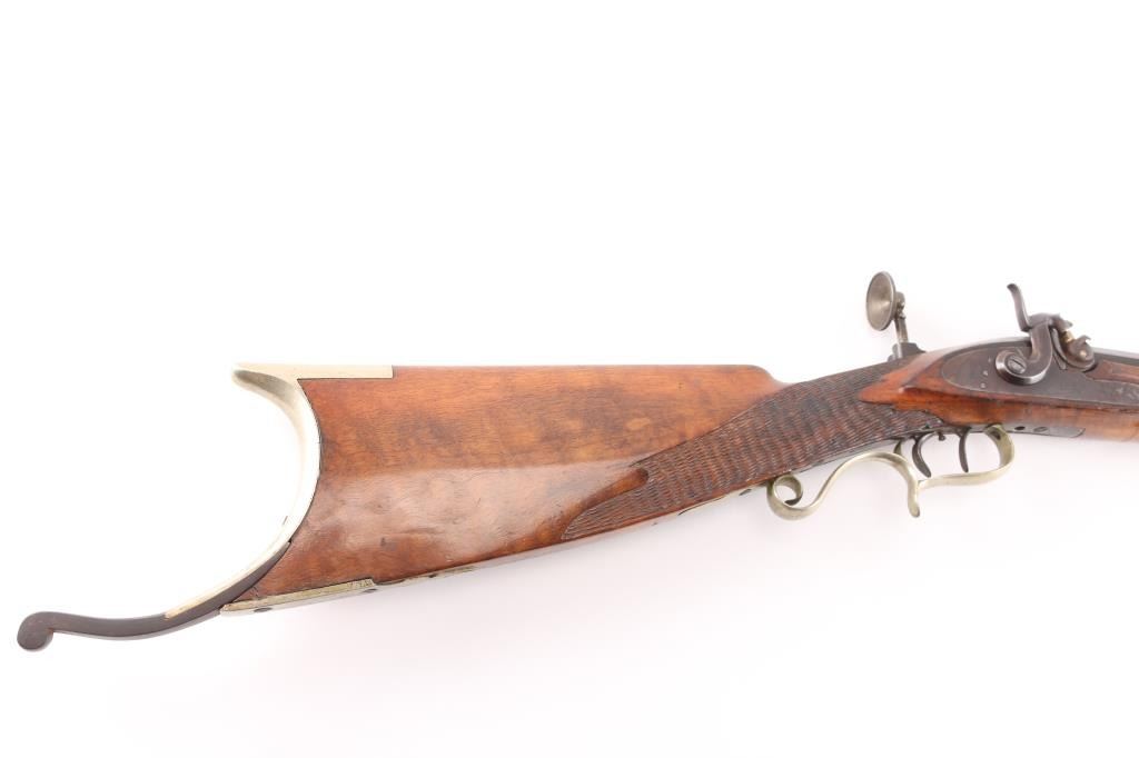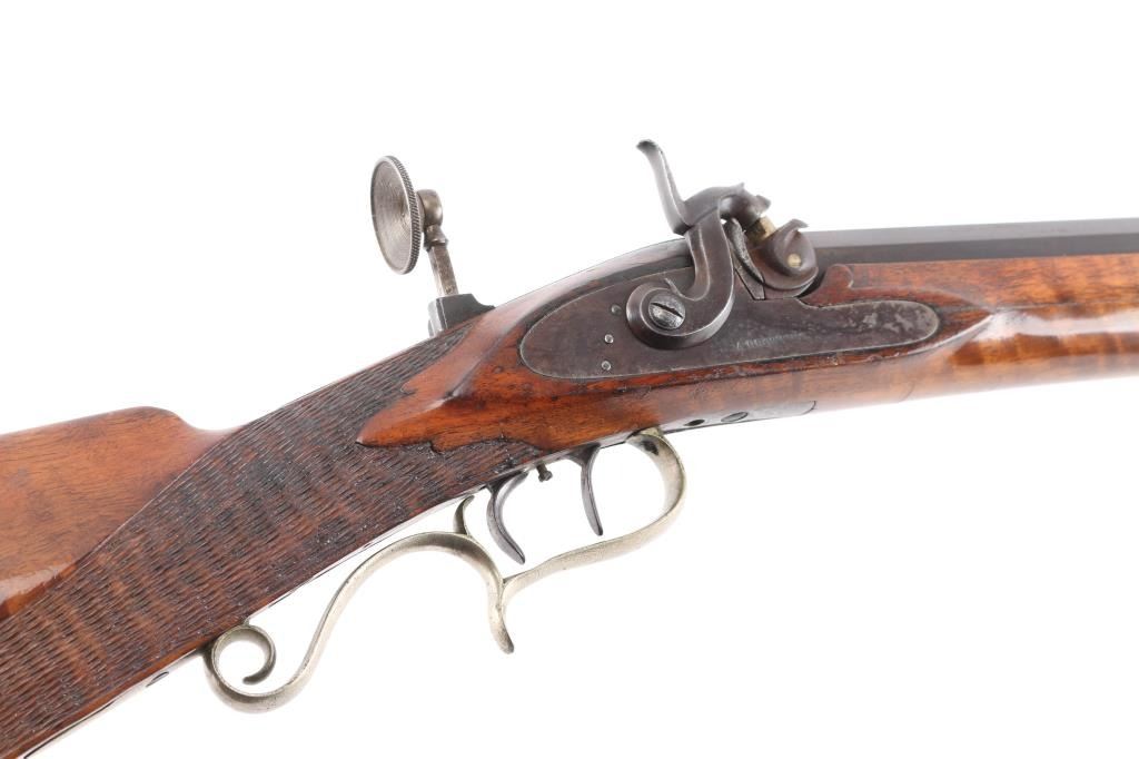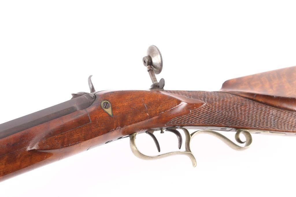 A. (August) Browning S.F. California marked muzzle loading target rifle circa about 1868-70s. Illustrated pg 45 of "California Gunsmiths - 1846-1900" by Larry Shelton and consigned by his estate. 42-43 caliber percussion with 30" barrel, semi-false muzzle, double set triggers, target sights, select grain checkered wood stocks that have been nicely repaired and refinished by a professional gunsmith. Good action and triggers. Working. Weighs about 10.95 lbs. Condition is NRA Very Good***Antique Firearm***