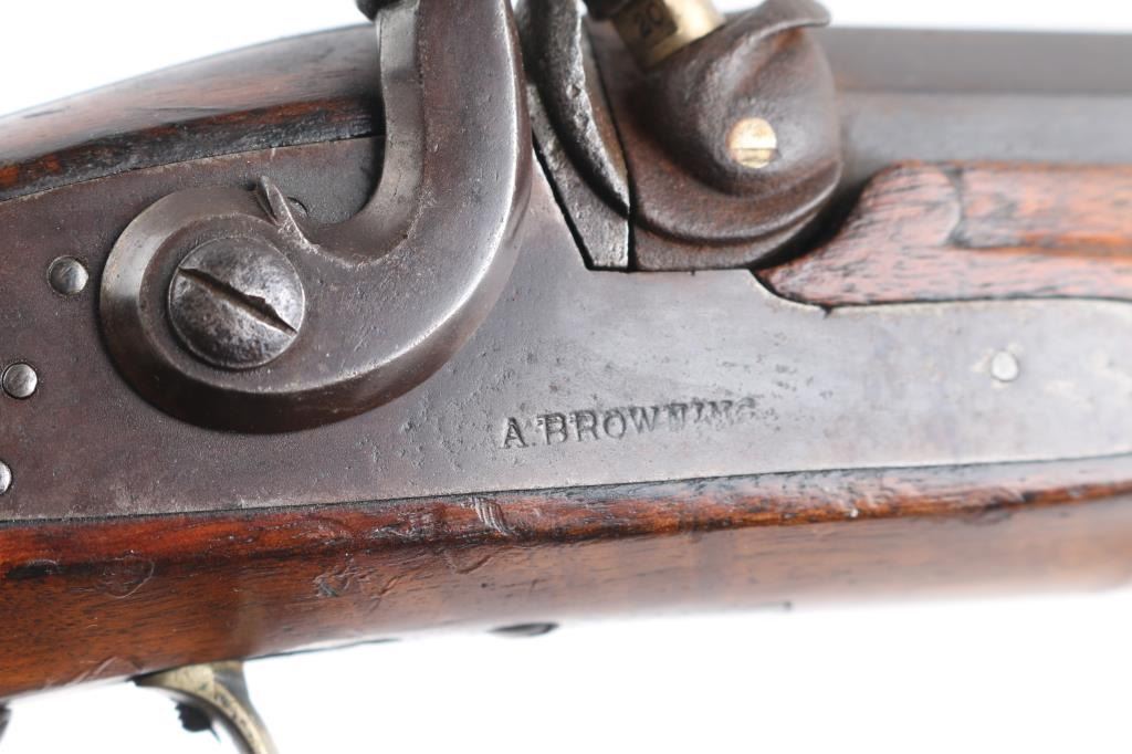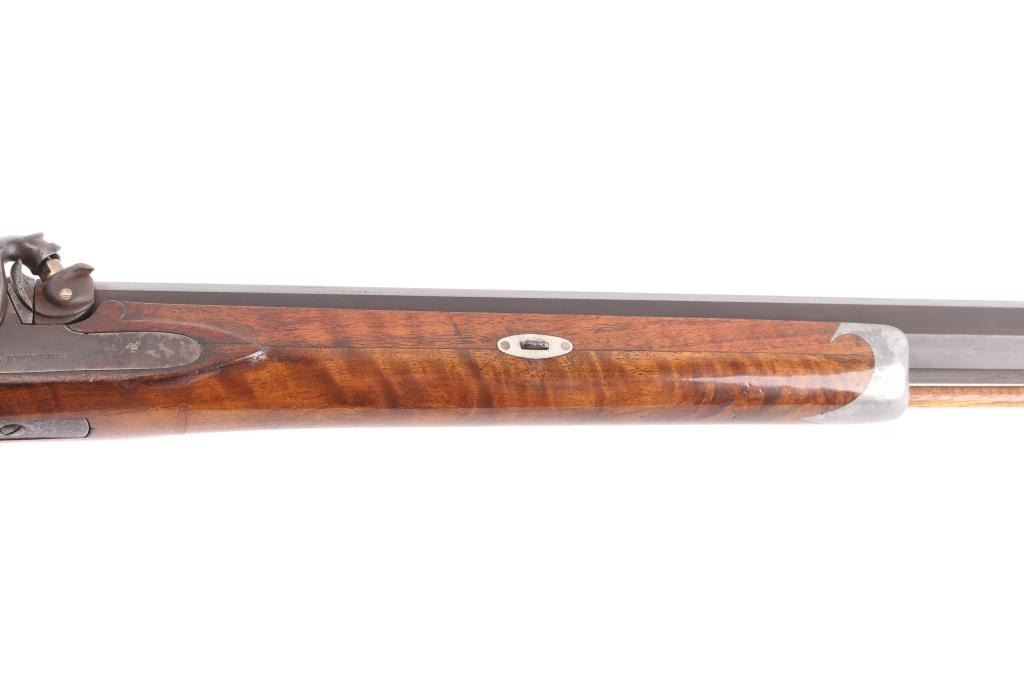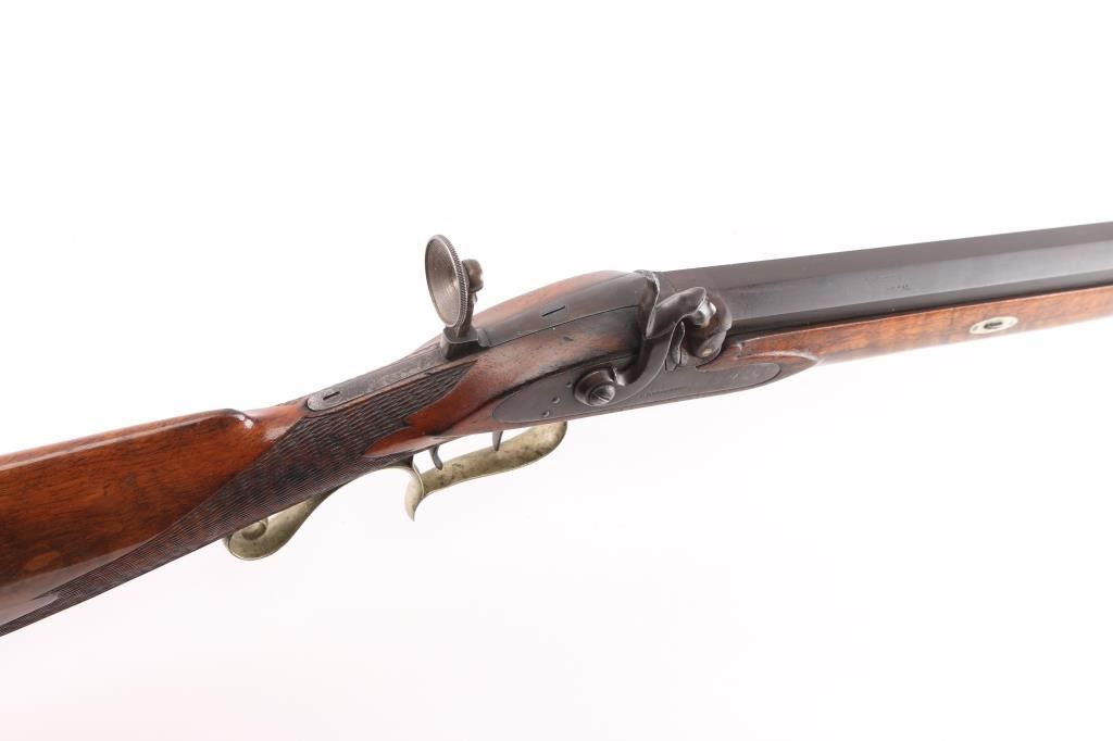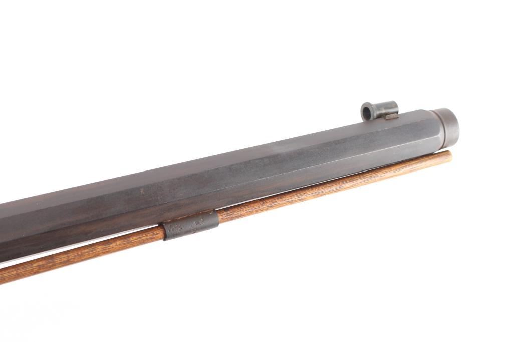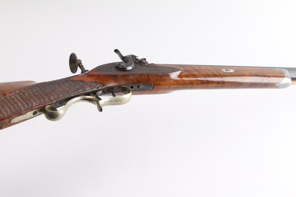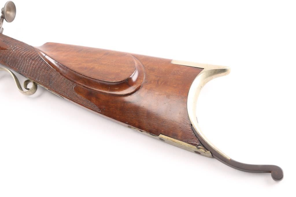 A. (August) Browning S.F. California marked muzzle loading target rifle circa about 1868-70s. Illustrated pg 45 of "California Gunsmiths - 1846-1900" by Larry Shelton and consigned by his estate. 42-43 caliber percussion with 30" barrel, semi-false muzzle, double set triggers, target sights, select grain checkered wood stocks that have been nicely repaired and refinished by a professional gunsmith. Good action and triggers. Working. Weighs about 10.95 lbs. Condition is NRA Very Good***Antique Firearm***
