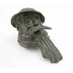 A Bruce Bairnsfather bronze model head of Old Bill, typically portrayed with helmet, squinting eyes and scarf, signed and impressed Rd 369204, 4.5 ins £80-120