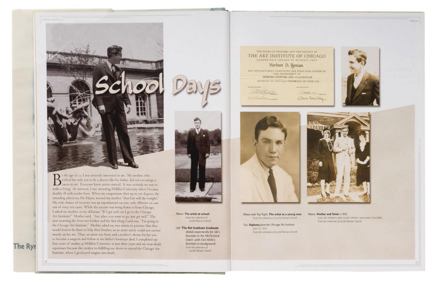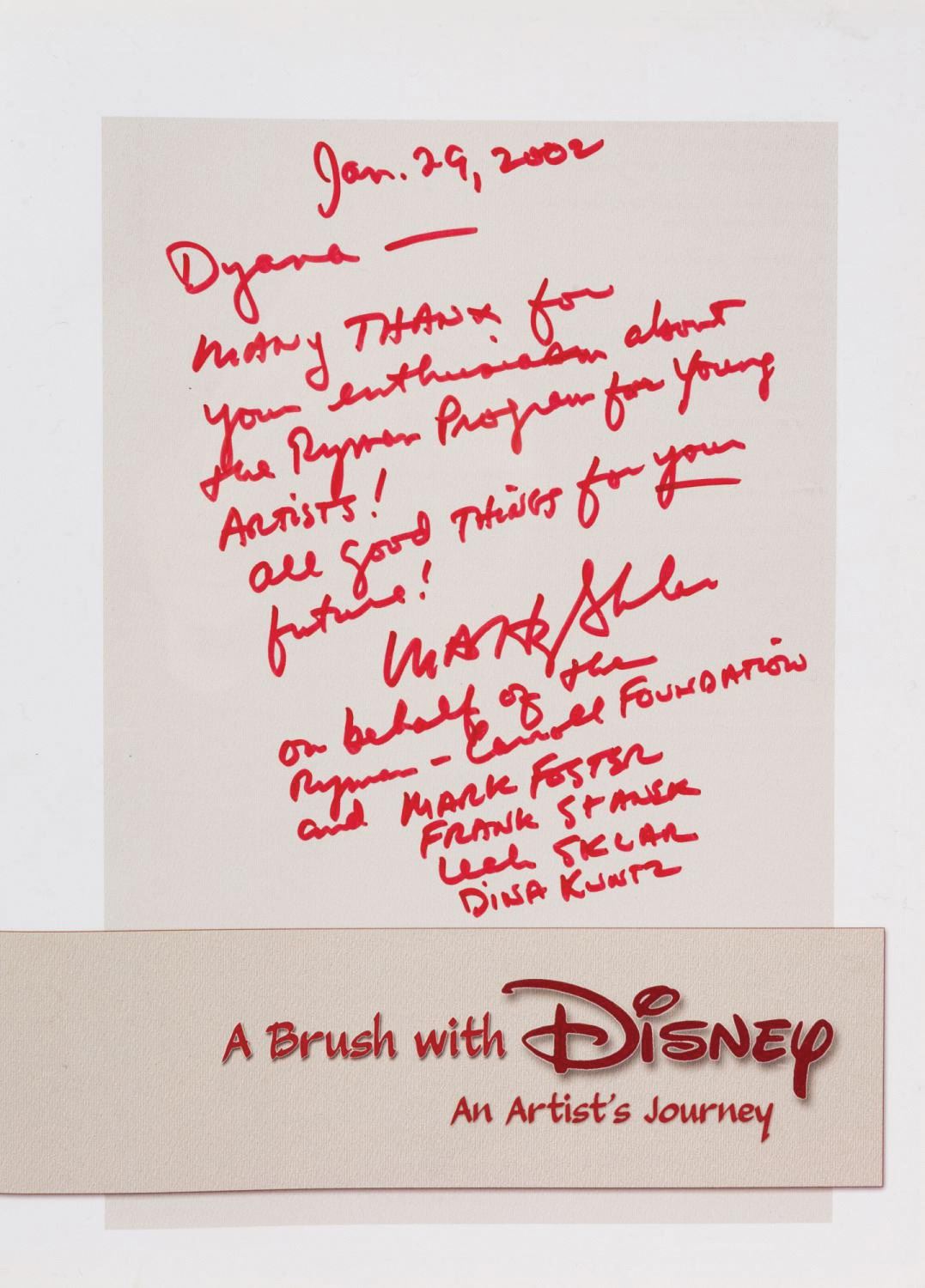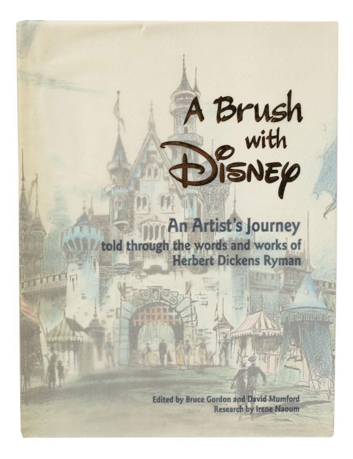 (Disney, 2000) A first-edition hardcover copy of "A Brush with Disney" by Bruce Gordon and David Mumford, inscribed inside by Marty Sklar on behalf of the Ryman-Carroll Foundation. The book was published to an edition of 2000 for the 10th anniversary of Ryman's namesake foundation. Featuring numerous anecdotes from his life and travels supported by his artwork, the book also describes his contributions toward the Disney Parks. Measuring 13.75"x10.5", the hardcover publication is in overall very good condition with a few small creases and tears to the dust jacket.