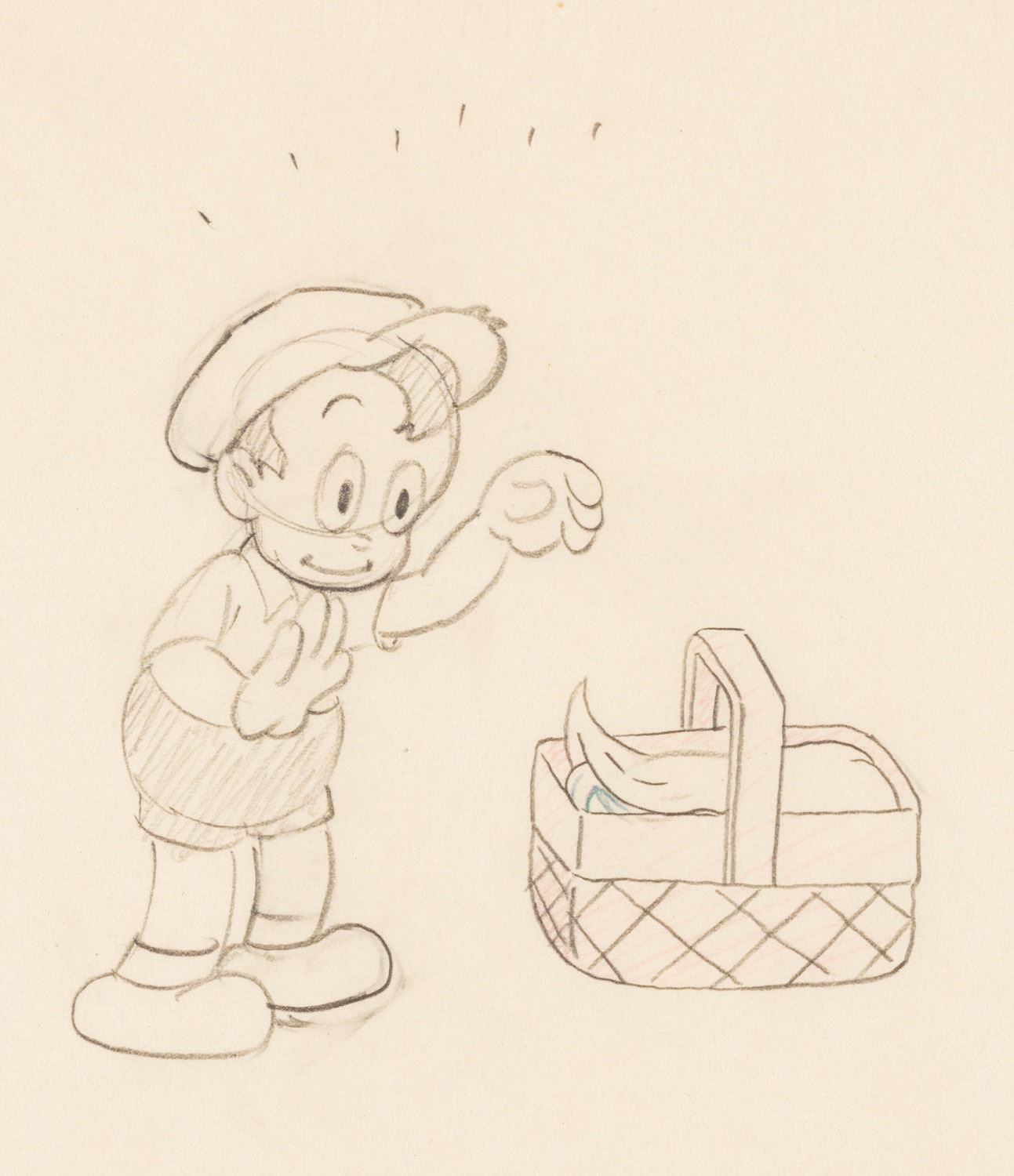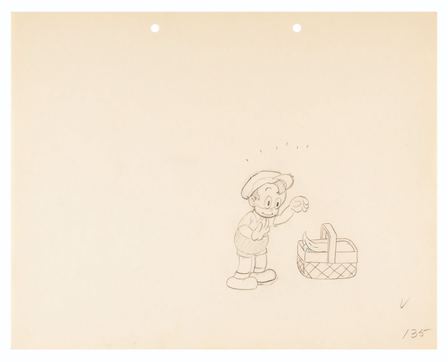 (Schlesinger, 1933) A production drawing of Buddy from his first short, “Buddy’s Day Out.” With a character image size of 3.5” x 3.75” on 9.5” x 12” animation paper, the graphite drawing is in very good condition with light creases.