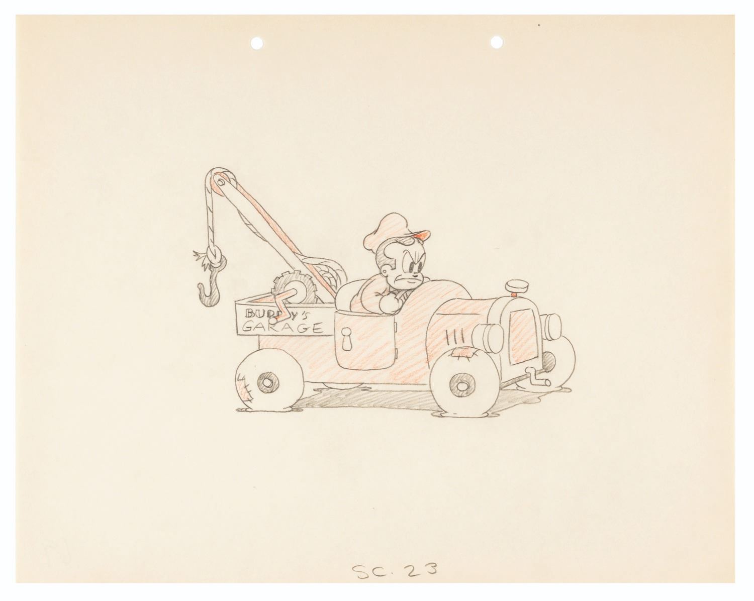 (Schlesinger, 1934) An original production story drawing from “Buddy’s Garage.” With an image size of 6.5” x 4.25” on 9.5” x 12” animation paper, the drawing accomplished in graphite and red pencil is in very good condition with very light color shift to the paper from age.