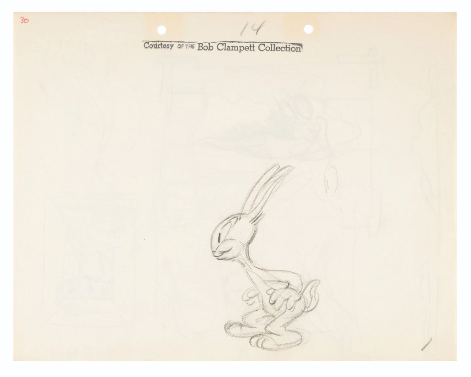 (Schlesinger, 1941) An original storyboard drawing of Bugs Bunny by Chuck Jones from the Merrie Melodies short “Elmer’s Pet Rabbit.” Measuring 9.5” x 12” overall, with a character image size of 5” x 7”, the graphite drawing is in very good condition, stamped “Courtesy of the Bob Clampett Collection,” with light edge wear and light discoloration from age.