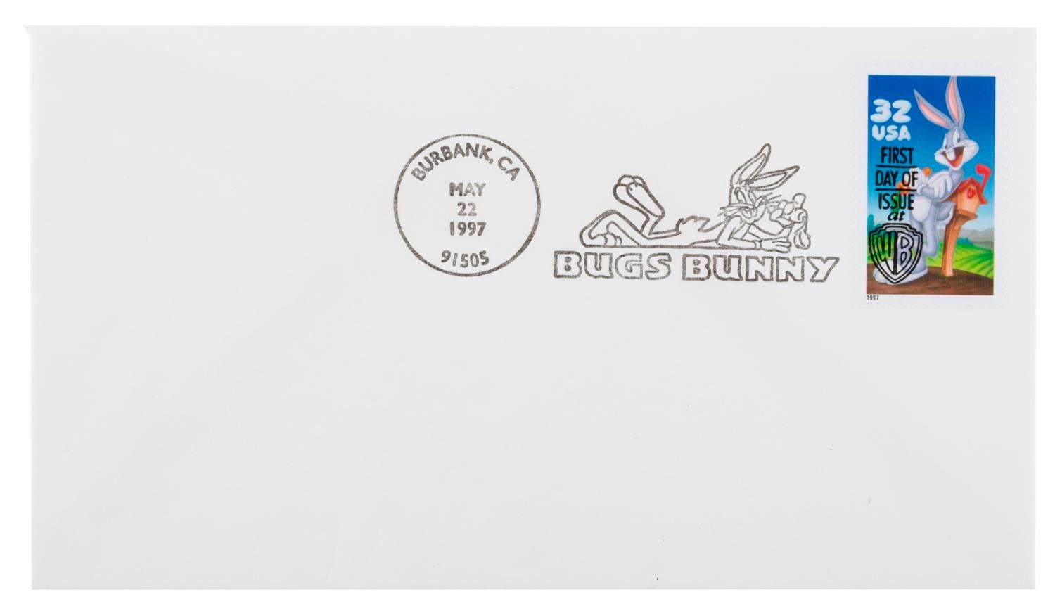 (USPS, 1997) A Bugs Bunny first day of issue stamp and envelope. The 32-cent stamp has"First Day of Issue at WB" printed on it, and the envelope features a Bugs Bunny ink stamp and is postmarked May 22, 1997, from Burbank, CA 91505. The USPS stamp measures 1" x 1.5" on a 3.75" x 6.5" envelope, in very good condition with light creases on the envelope.