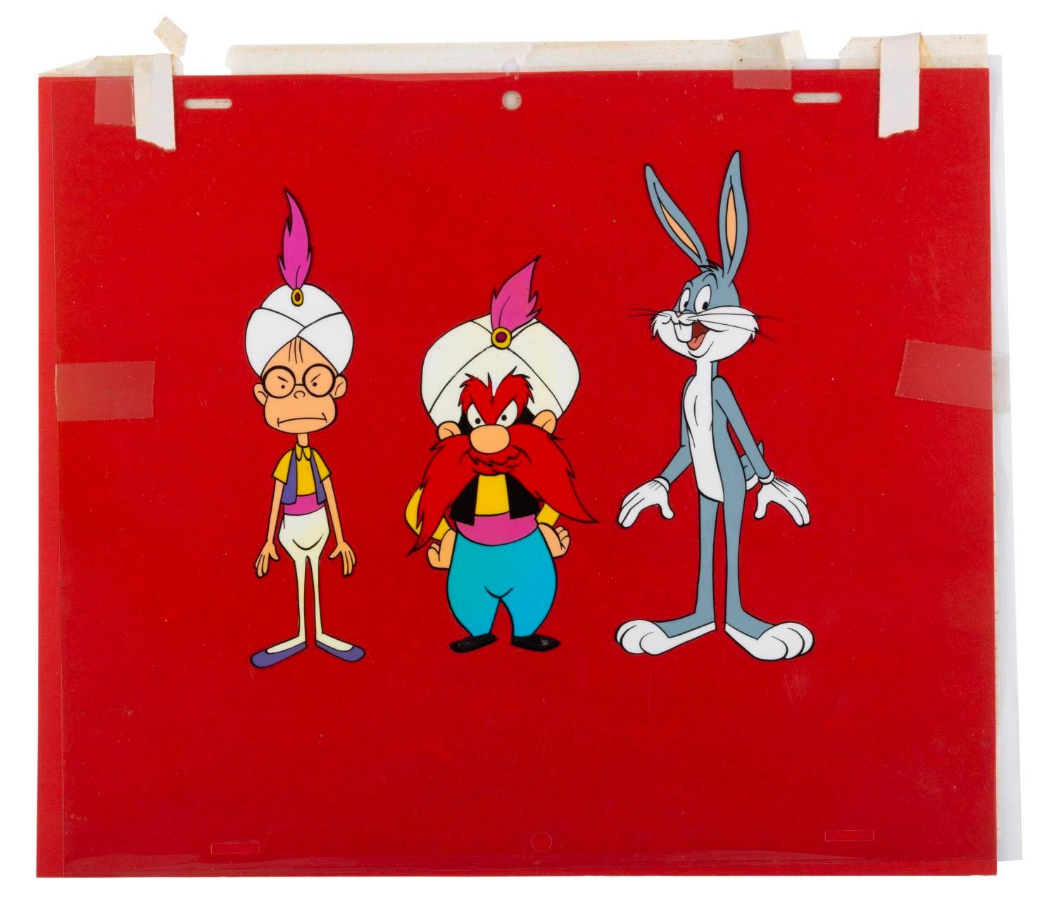 (Warner Bros., 1982) An original color model cel of Bugs Bunny, Sultan Yosemite Sam, and his son, Prince Abba-Dabba, from the production of “1001 Rabbit Tales.” With an image size of 7.5” x 6.75” on a 10.5” x 12.5” cel, the piece is in good production-used condition with light discoloration to Abba-Dabba’s pants and Sam’s turban, and sections of tape along the top and side edges which do not affect the image.