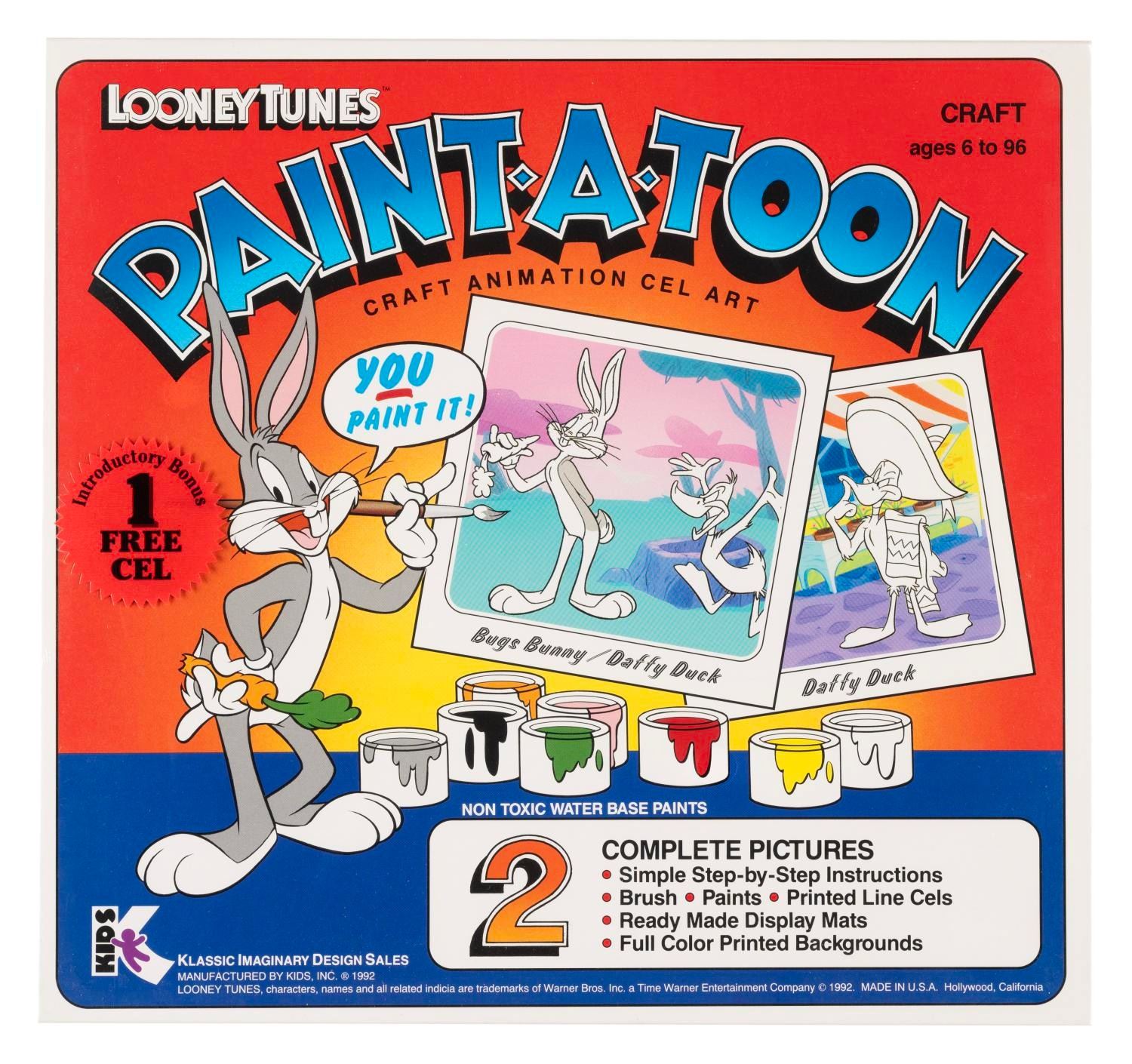 (Warner Bros., 1987) A Looney Tunes Paint-A-Toon kit for crafting cel animation art. The kit includes two unpainted printed line art cels featuring Bugs Bunny and Daffy Duck, paints, brush, instructions, and display mats with color backgrounds. Measuring 10” x 11” x 1” deep, the sealed and unopened kit is in fine condition.