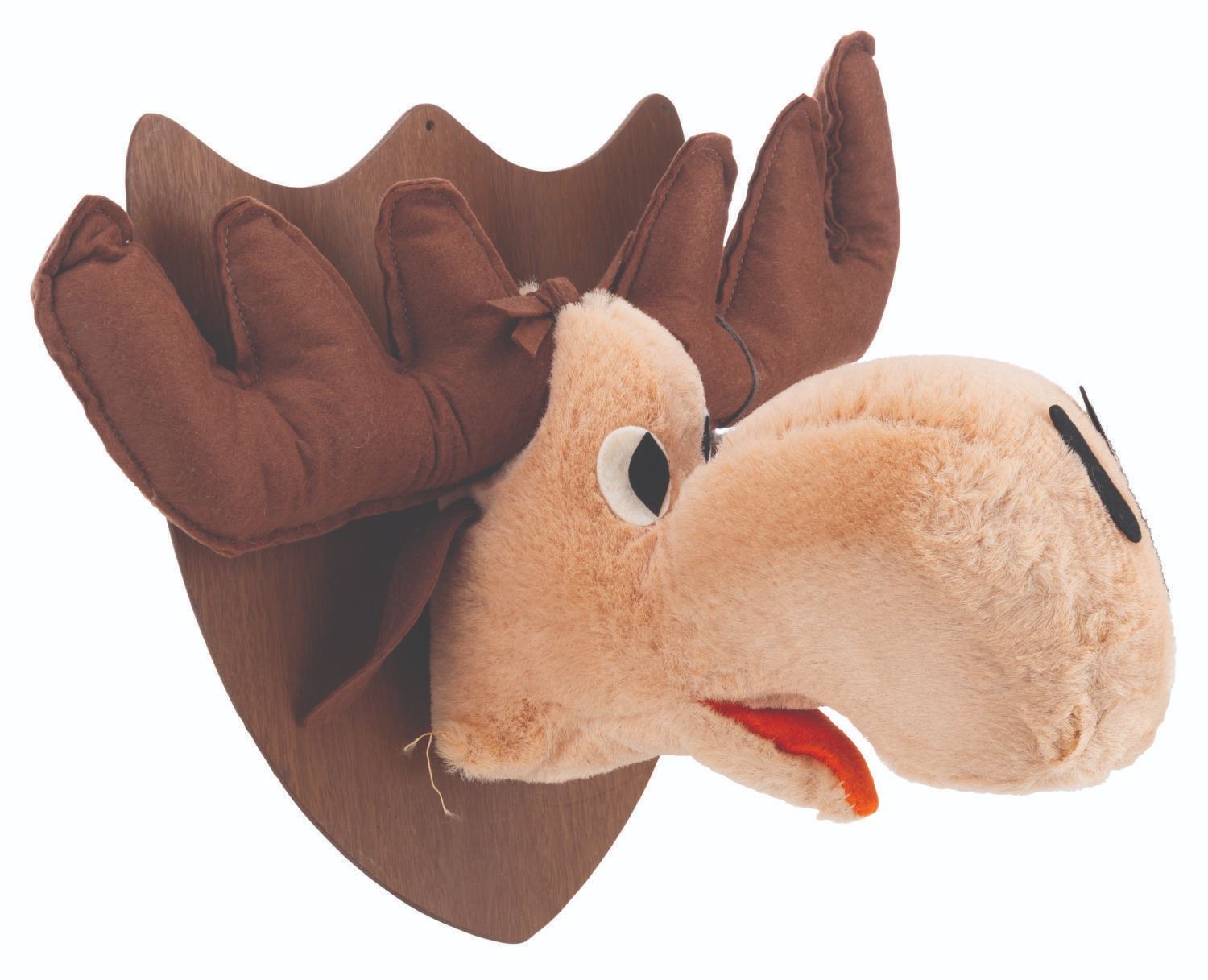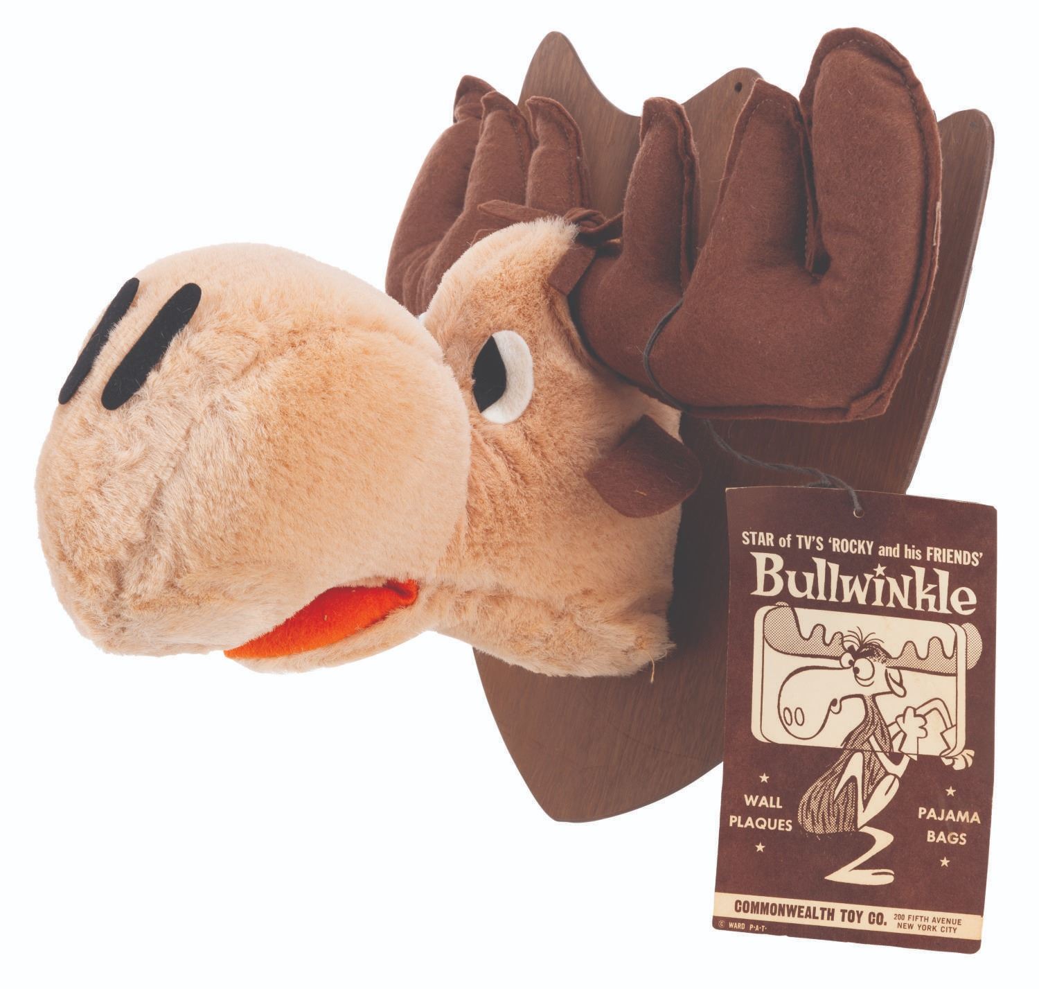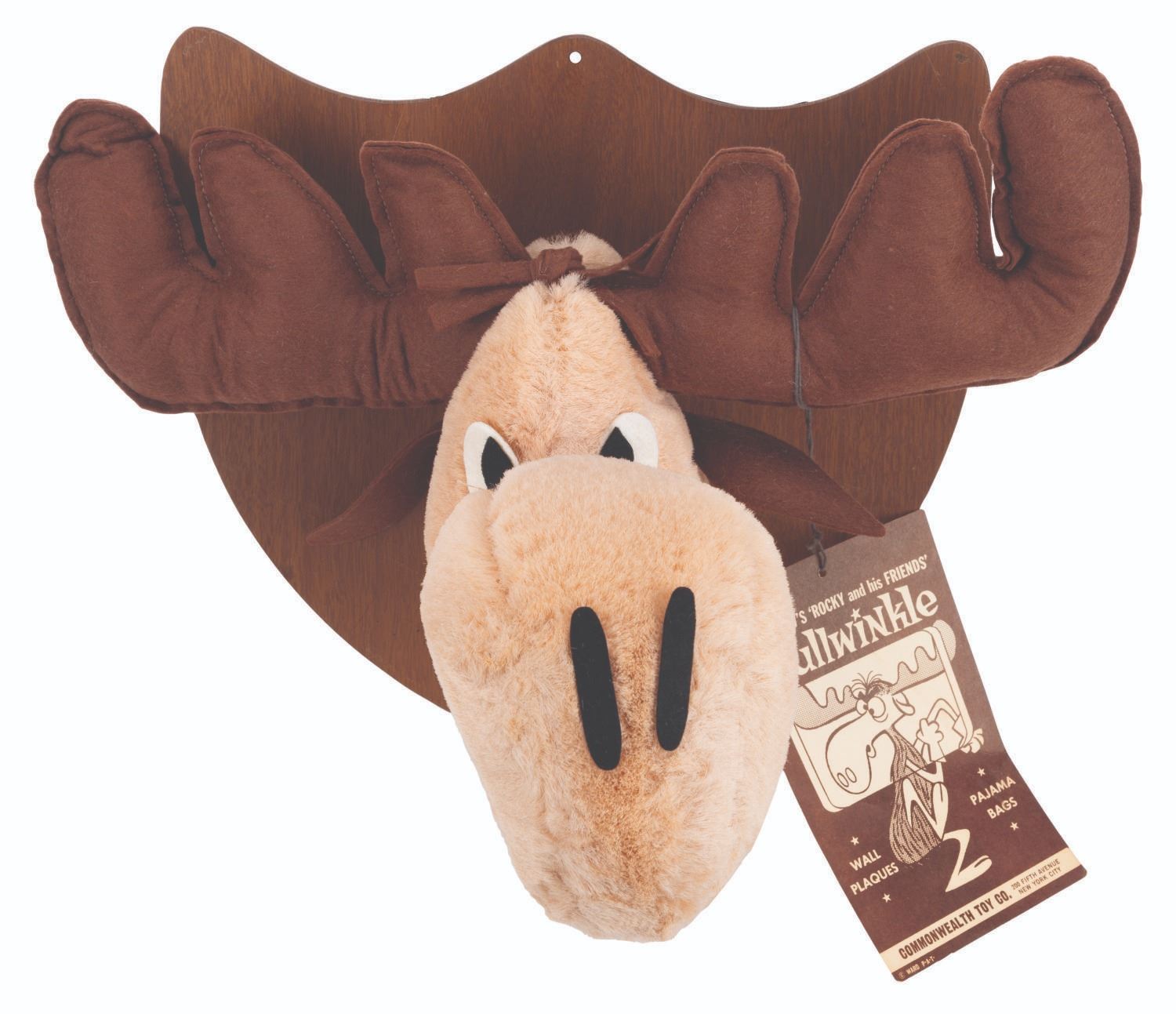 (Commonwealth Toy, 1960s-80s) A plush Bullwinkle Wall Plaque in traditional hunting trophy style, with the original tag. Measuring 16” x 13” x 10”, the plush head on wooden plaque is in very good condition.