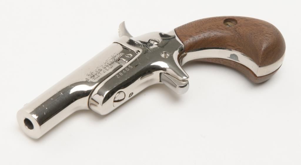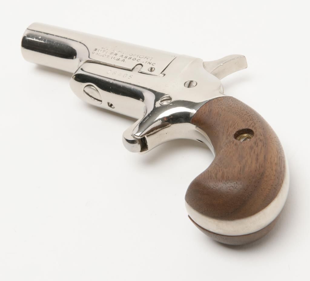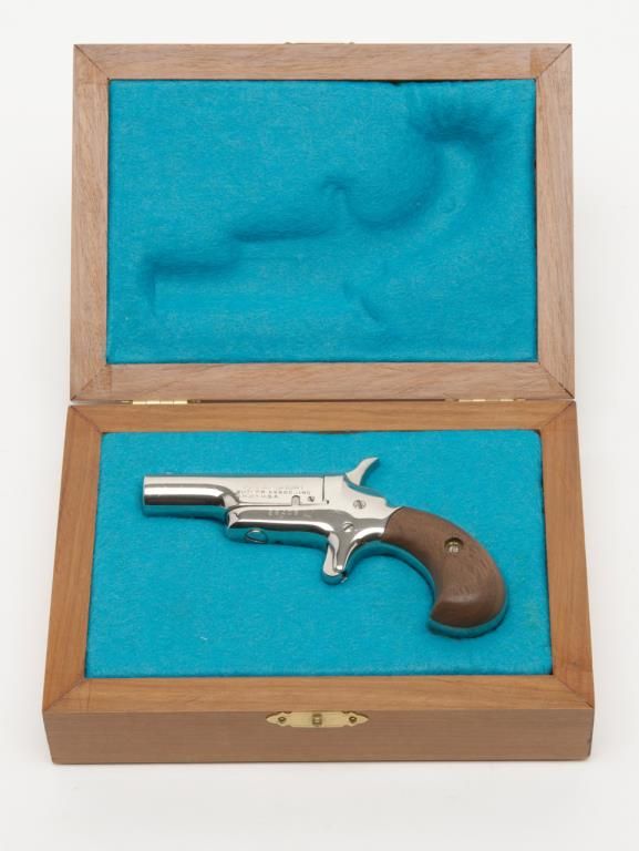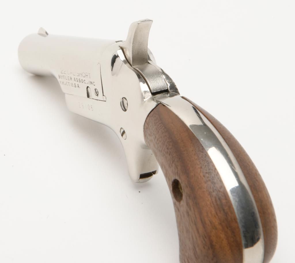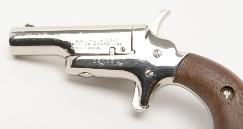 A Butler Assoc. Inc. modern single-shot derringer pistol, cal. .22 short, Serial # 28405. The pistol is in overall very good to fine condition with a 2-3/8" barrel. The pistol shows nearly all of its nickel finish with smooth wood grips thatshow little use. The gun comes in a homemade presentation case lined in blue felt. (Modern/PPT). Est.: $125-$250