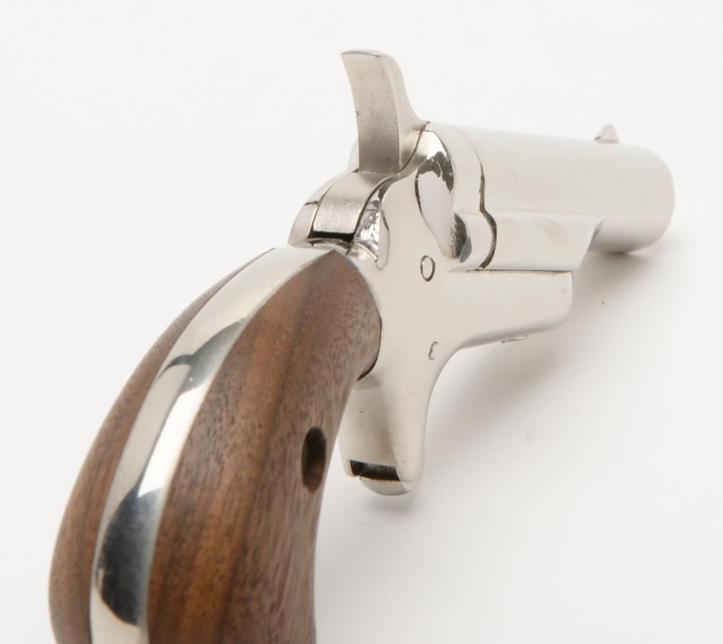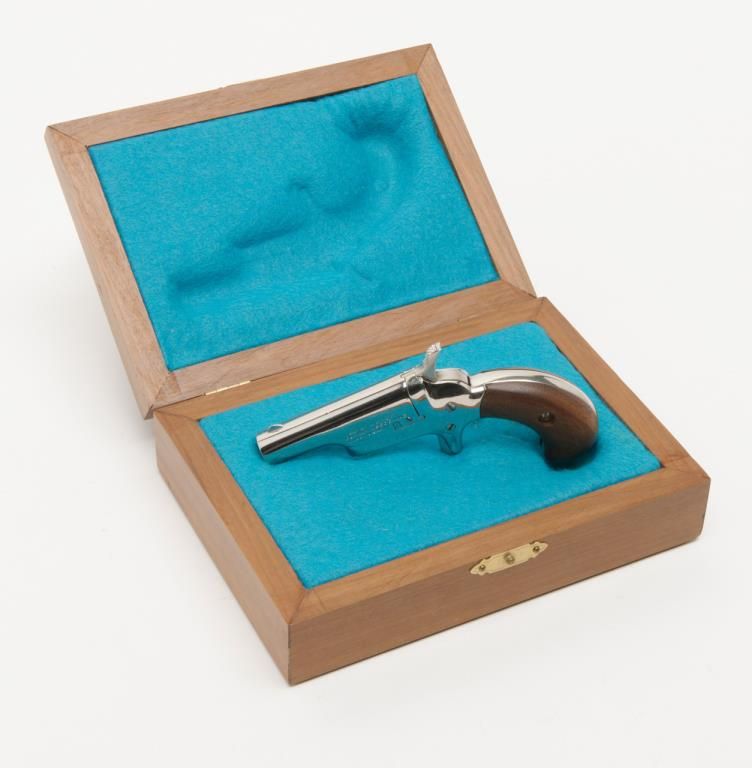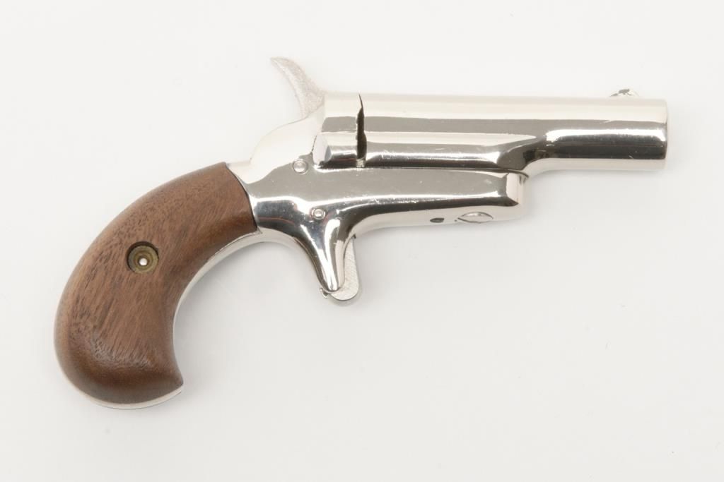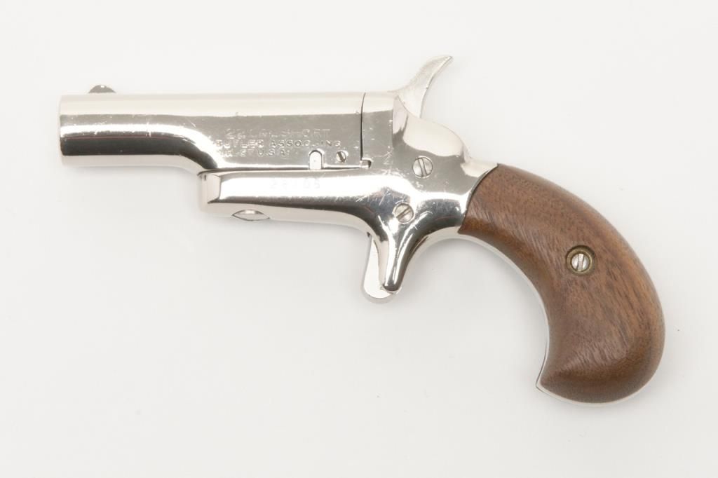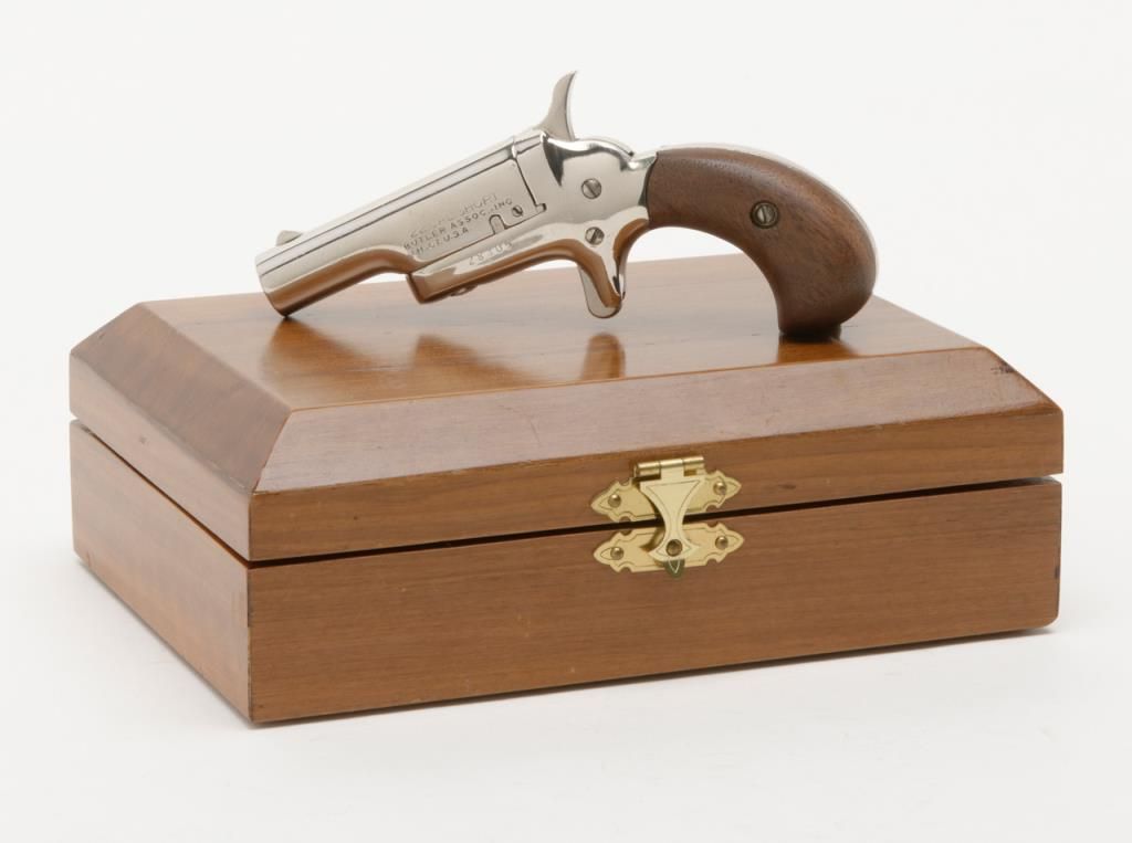 A Butler Assoc. Inc. modern single-shot derringer pistol, cal. .22 short, Serial # 28405. The pistol is in overall very good to fine condition with a 2-3/8" barrel. The pistol shows nearly all of its nickel finish with smooth wood grips thatshow little use. The gun comes in a homemade presentation case lined in blue felt. (Modern/PPT). Est.: $125-$250