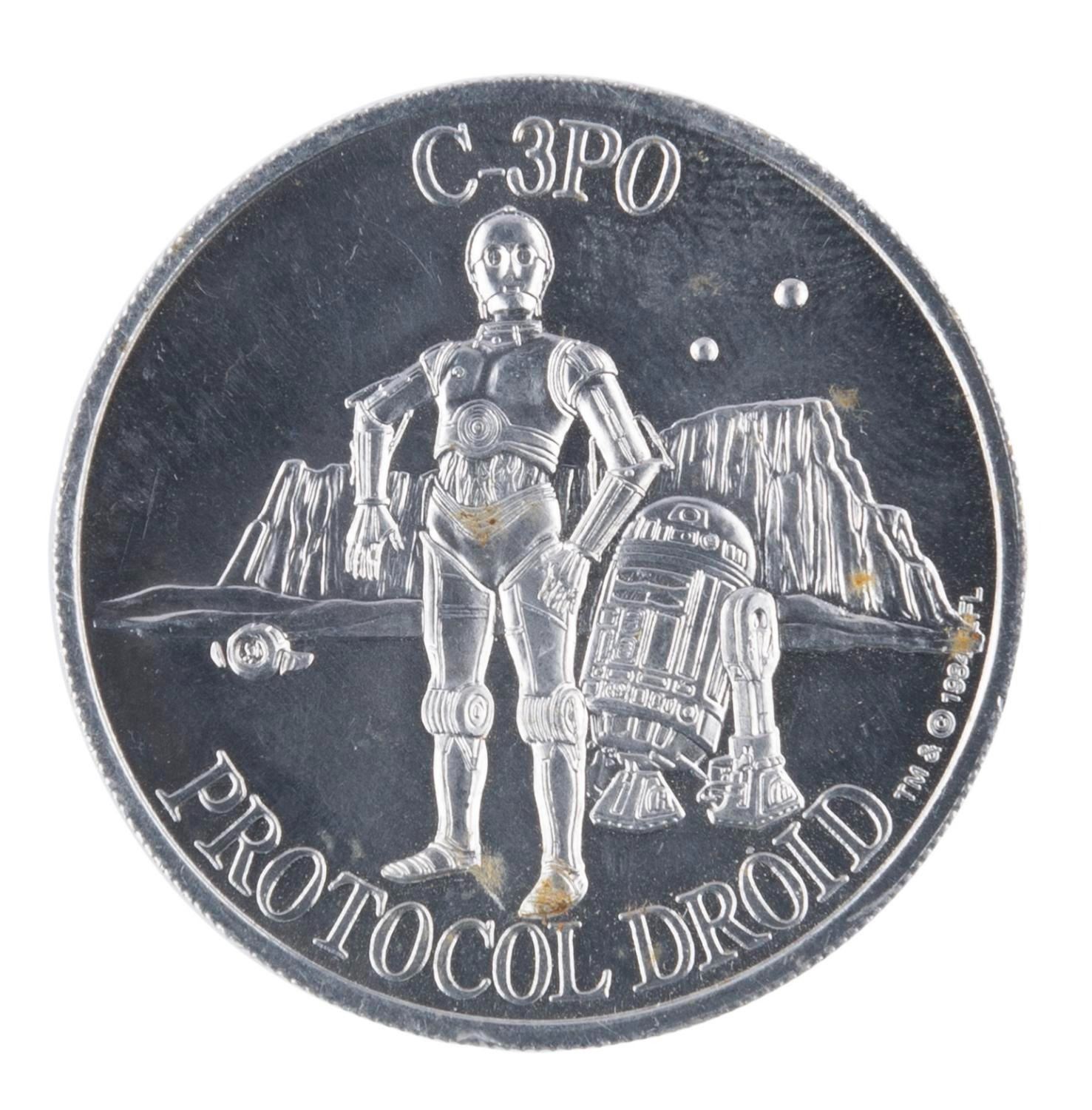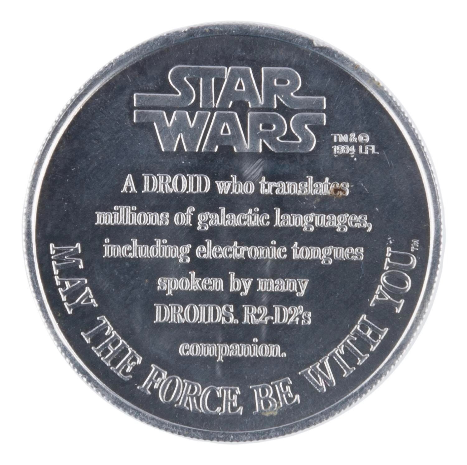 (Kenner, 1984) A Power of the Force Collector Coin of C-3PO from Star Wars. Measuring 1.5” in diameter, the metal coin displays in good condition with light wear and light spots of discoloration.
