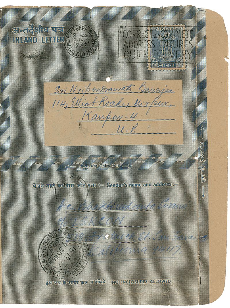 Spiritual teacher (1896–1977) who founded the International Society for Krishna Consciousness. ALS signed “A. C. Bhaktivedanta Swami,” one page, 7.25 x 10.5, December 13, 1967. Letter to Nripendawath Banerjea, a follower in the village of Karpur. In part: “The Calcutta situation having come down to normal condition, I have now purchased my ticket for Japan (Tokyo) on my way to San Francisco & New York…My disciples…can give lectures in Vaishnava cult and if possible you can arrange for their Kistrant lectures; otherwise they may go to Mathura after taking rest for one day or so. I hope this will find you in good health and I shall be glad to hear from you to my San Francisco address.” In very good condition, with fragile intersecting folds (some with partial separations), overall creases, and a few edge chips and tears. In 1965, Bhaktivedanta left India for the US where he struck a chord with the emerging counterculture movements and in 1966 he founded the International Society for Krishna Consciousness. He amassed a large number of followers in San Francisco, the epicenter of hippie culture, and his followers introduced the message to all corners of the globe—most notably to England, where the movement acquired its most famous adherent, the Beatles’ George Harrison. The Calcutta situation mentioned in this letter most likely refers to the upheaval caused in the Bengali city by Naxalites, a group of militant communists whose violent uprising included a take-over of Calcutta’s Jadavpur University, the assassination of authority figures, and attacks on the police.