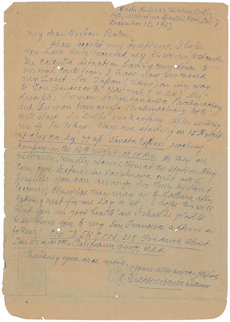 Spiritual teacher (1896–1977) who founded the International Society for Krishna Consciousness. ALS signed “A. C. Bhaktivedanta Swami,” one page, 7.25 x 10.5, December 13, 1967. Letter to Nripendawath Banerjea, a follower in the village of Karpur. In part: “The Calcutta situation having come down to normal condition, I have now purchased my ticket for Japan (Tokyo) on my way to San Francisco & New York…My disciples…can give lectures in Vaishnava cult and if possible you can arrange for their Kistrant lectures; otherwise they may go to Mathura after taking rest for one day or so. I hope this will find you in good health and I shall be glad to hear from you to my San Francisco address.” In very good condition, with fragile intersecting folds (some with partial separations), overall creases, and a few edge chips and tears. In 1965, Bhaktivedanta left India for the US where he struck a chord with the emerging counterculture movements and in 1966 he founded the International Society for Krishna Consciousness. He amassed a large number of followers in San Francisco, the epicenter of hippie culture, and his followers introduced the message to all corners of the globe—most notably to England, where the movement acquired its most famous adherent, the Beatles’ George Harrison. The Calcutta situation mentioned in this letter most likely refers to the upheaval caused in the Bengali city by Naxalites, a group of militant communists whose violent uprising included a take-over of Calcutta’s Jadavpur University, the assassination of authority figures, and attacks on the police.