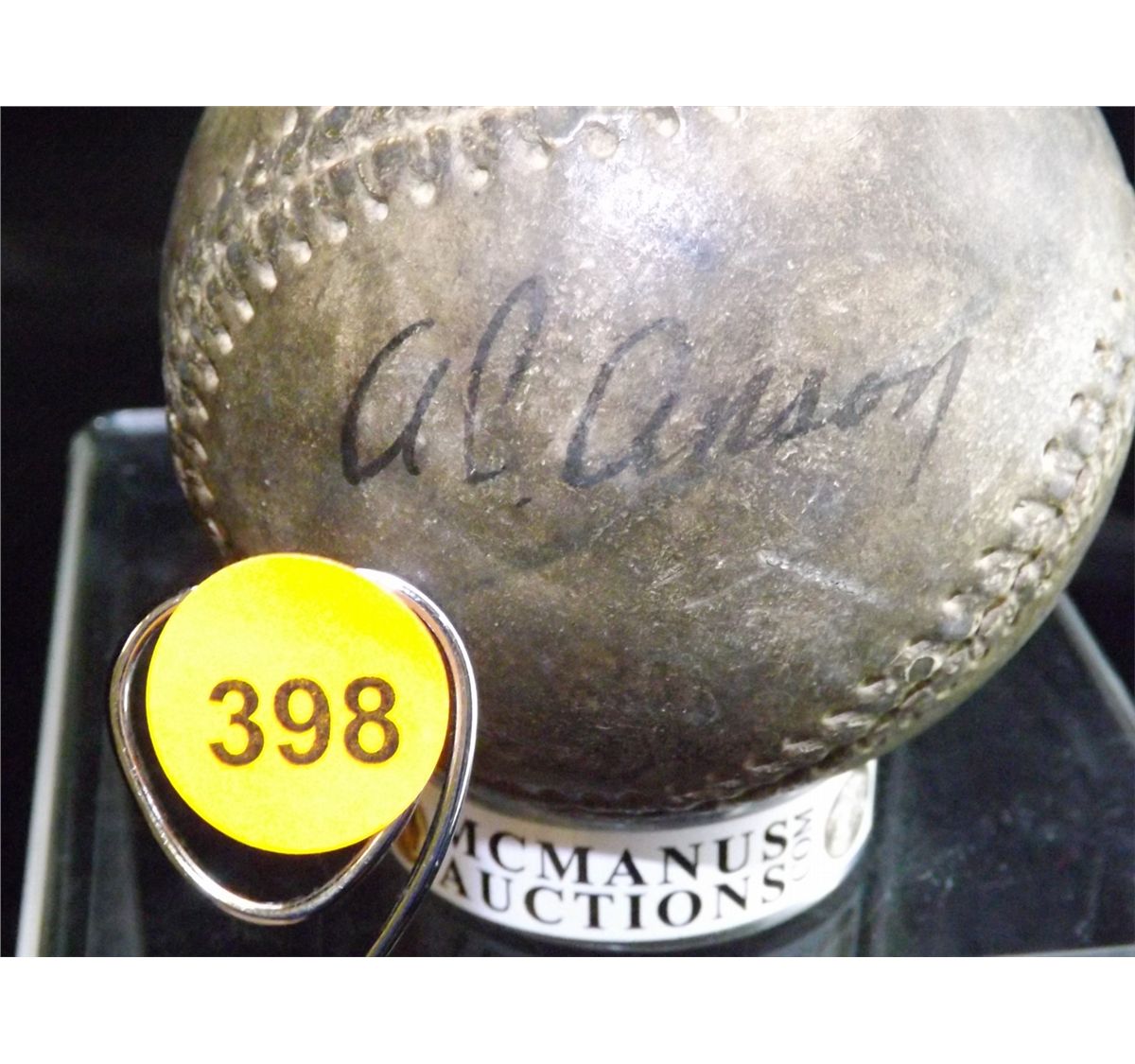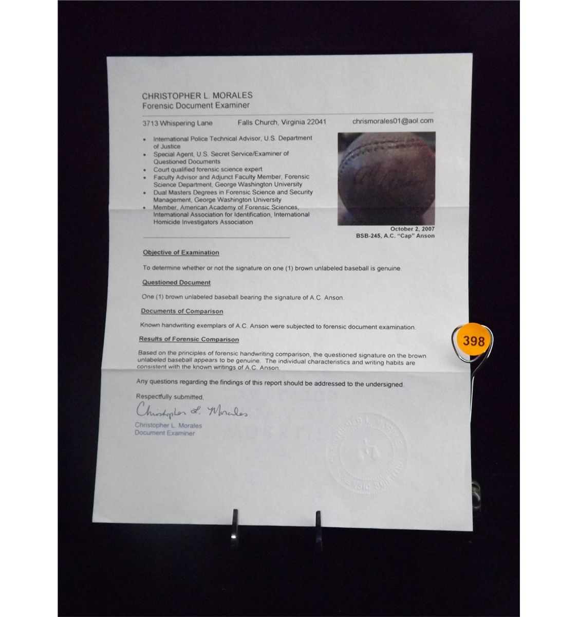 A.C. "Cap" Anson Autographed Baseball. Unlabeled Brown Baseball. Appraised or estimated retail value $50,000. COA by Christopher Morales. All Sales Final. Please see terms and conditions of auction.