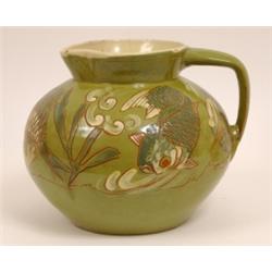 A C H Brannam Studio Jug, decorated fish and seaweed on a green ground dated 1896 (a.f.), 23 cm See illustration