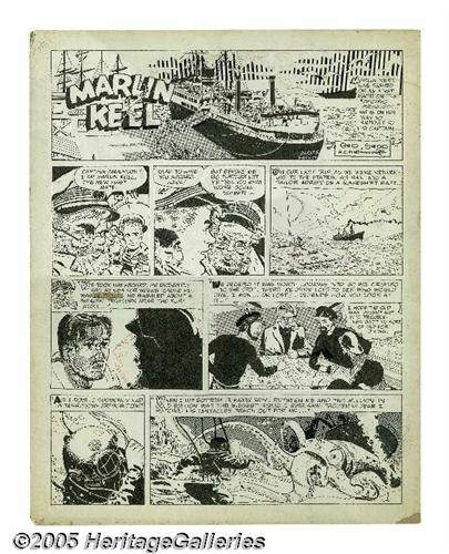 <B>A.C. Hollingsworth and George Shedd - Marlin Keel Sunday Comic Strip Original Art (circa 1954).</B></I> Fantastic undersea action-adventure is showcased in this spectacular Sunday drawn by A.C. Hollingsworth. George Shedd's early interest in comic strips lead him to an apprenticeship with Al Capp on <I>L'il Abner</B></I>, and then to his own adventure strip <I>Marlin Keel</B></I>, which was syndicated nationally. Soon, other artists such as Bob Bolling and A.C. Hollingsworth were assisting Shedd on his feature. Alvin Carl Hollingsworth was a fascinating figure in the comics field. He was a high school classmate of Joe Kubert's at the High School of Music and Art and he was one of the few African-Americans to work in comic books and strips. Hollingsworth was born in New York City and began drawing at the age of four. By the age of twelve, he was working as an assistant at Holyoke Publishing Company and helped on <B>Catman Comics</B></I>. A year later he began doing illustrations for crime comics. Hollingsworth left the comic strip field to pursue a career in the world of fine art. NBC hired Hollingsworth to tour the East Coast, lecture, demonstrate painting, and host a ten-part series, "You're Part of Art." His paintings dealt with themes of contemporary social issues such as the Civil Rights movement, women's struggles, spiritual concepts, jazz, city life, and dance. He was also a mural designer, author, poet, and lecturer. From 1980 until his retirement in 1998, Hollingsworth was a full Professor of Art at Hostos Community College of the City University of New York. He passed away in 2000. The image area of this strip measures 16" x 21", and aside from some minor wear and paper aging, the art is in Excellent condition.