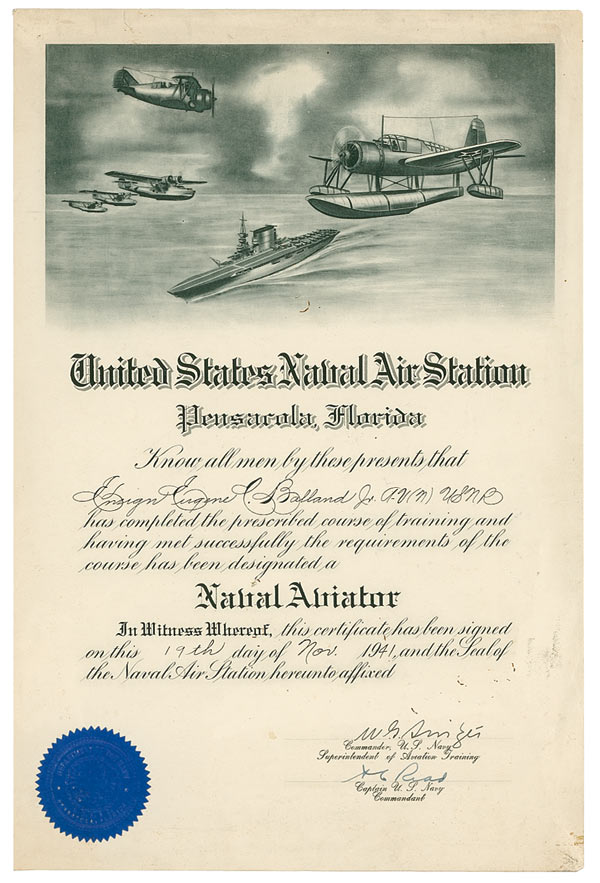 DS, signed “A. C. Read,” one page, 10 x 15, November 19, 1941. In part: “United States Naval Air Station Pensacola, Florida. Know all men by these presents that Ensign Eugene C. Balland, Jr…has completed the prescribed course of training and having met successfully the requirements of the course has been designated a Naval Aviator.” Countersigned by W. G. Switzer, the US Navy’s Superintendent of Aviation Training and later commander of the aircraft carrier USS Wasp in World War II. An official blue seal is affixed. Scattered creasing and soiling, otherwise fine condition. Less than three weeks later, the United States would be attacked at Pearl Harbor, Hawaii. Accompanied by an original, unsigned illustrated sheet music for the ‘MC-4 March’ dedicated to Read.