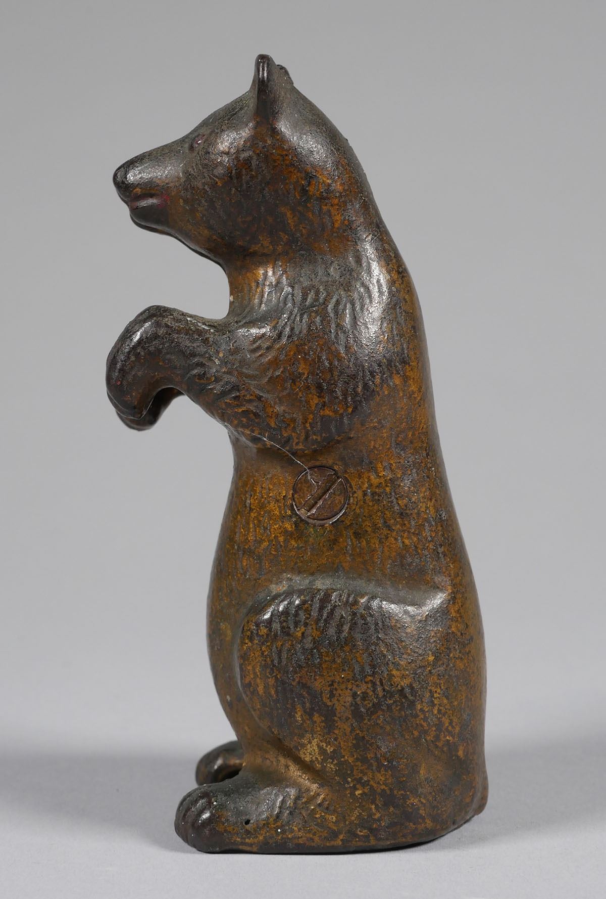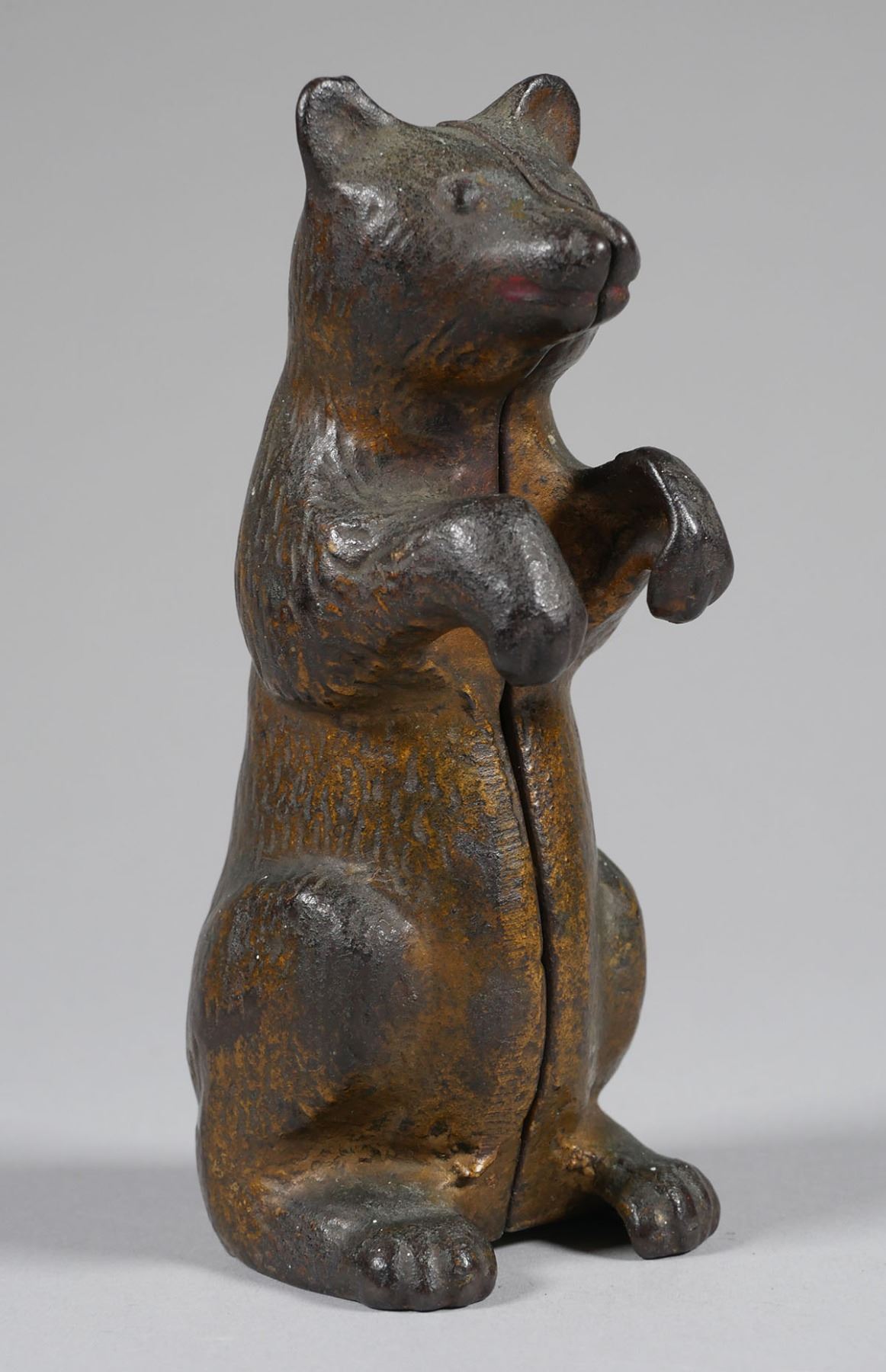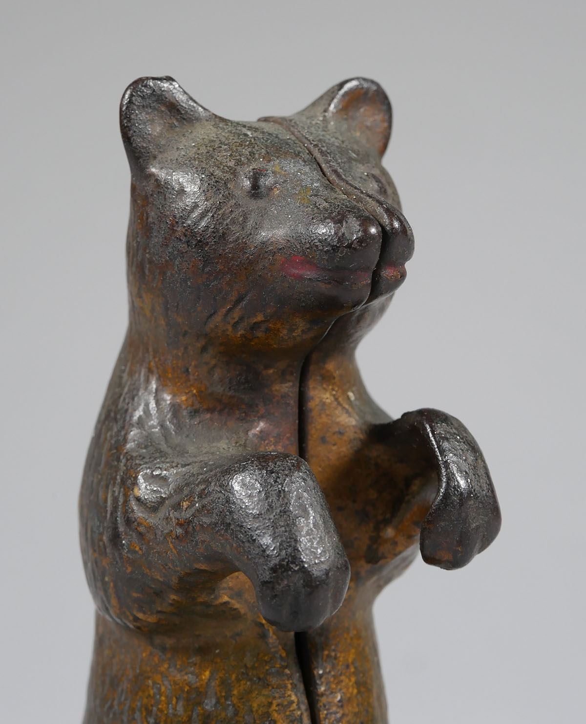 Cast iron "Begging Bear" still bank by A.C. Williams, circa 1910s to 1920s. Good condition with original finish. Measures 5 3/8" long.