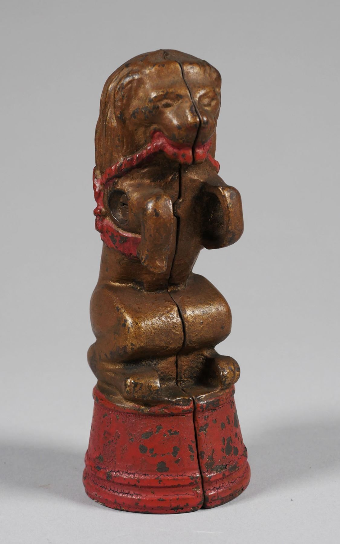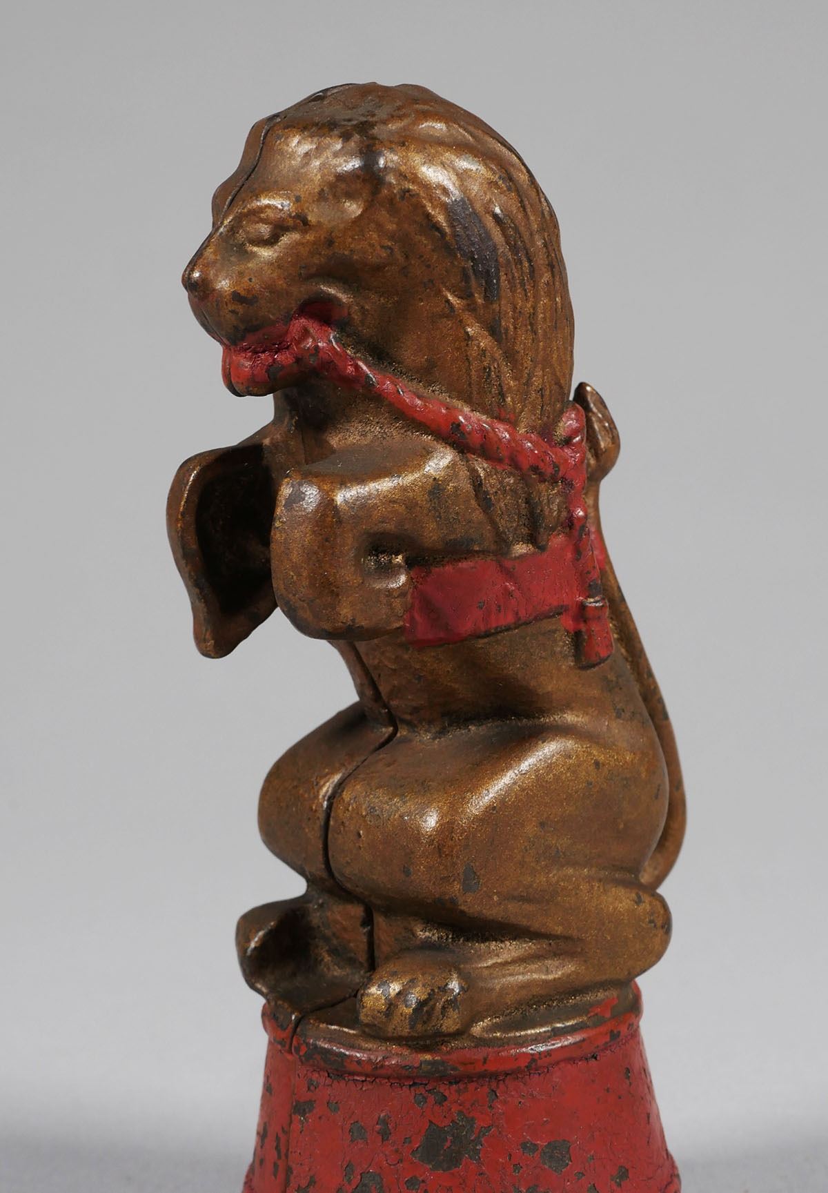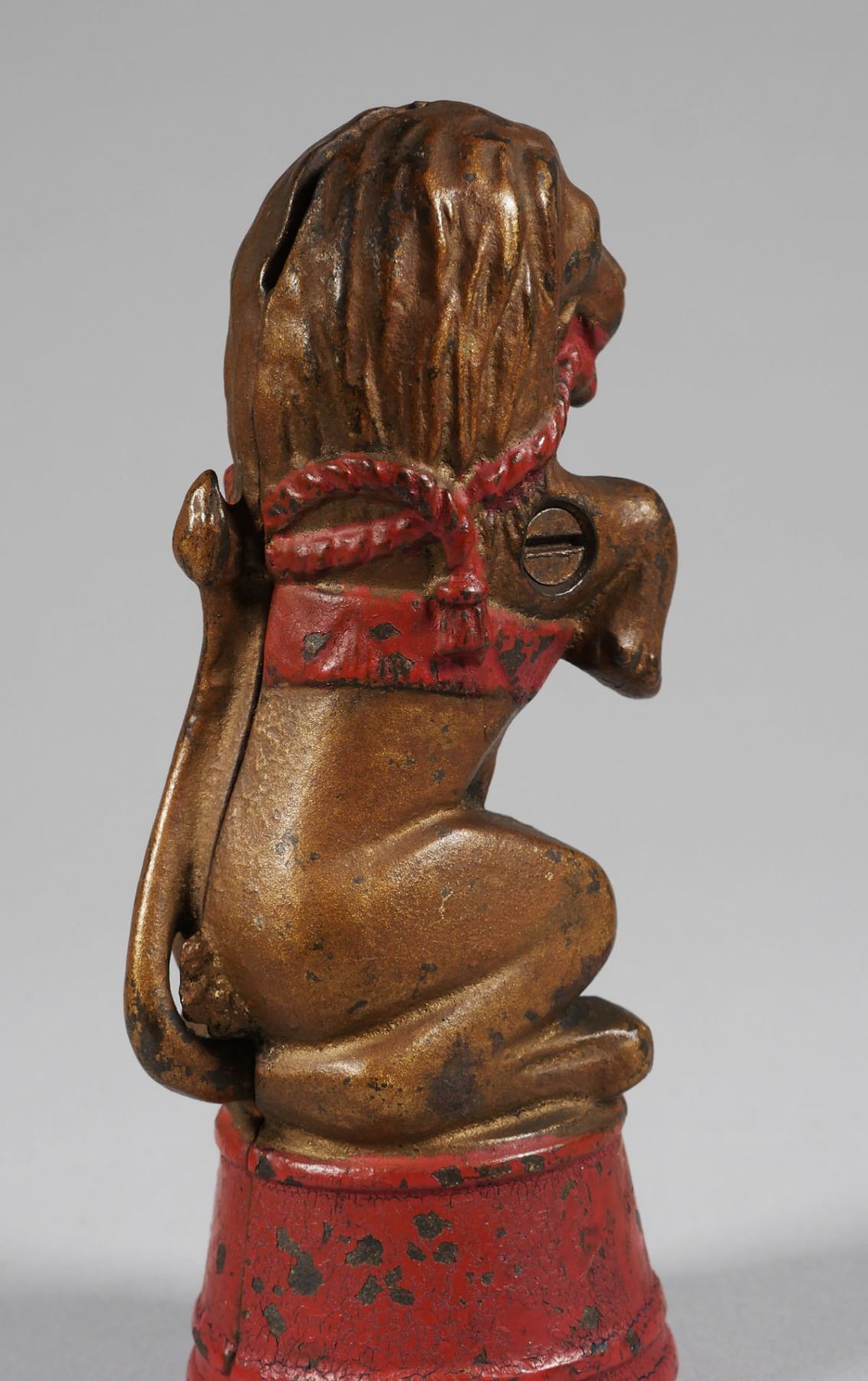 Cast iron "Lion on Tub" still bank by A.C. Williams, circa 1920s. Good condition with original gold and red paint. Measures 5 1/4" tall.