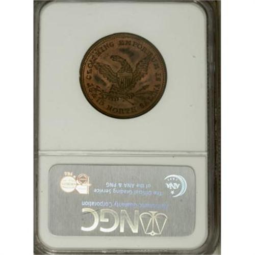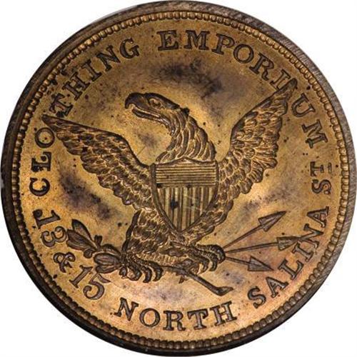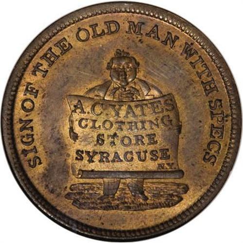 <B>(1850s) A.C. Yates, Syracuse, NY, MS63 Red and Brown NGC.</B></I> Miller-NY-1029. Struck in copper with a plain edge. Unabraded and well struck with moderate carbon and ample remaining brick-red iridescence. An identical eagle motif, derived from the contemporary ten dollar piece, was used on several different store cards of the 1850s.<BR><BR><b>Shipping:</b> Coins & Currency (<a target="_blank" href="http://www.heritageauctions.com/common/shipping.php">view shipping information</a>)