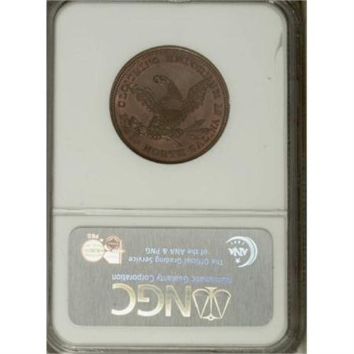 <B>(1850s) A.C. Yates, Syracuse, NY, MS65 Red and Brown NGC.</B></I> Miller-NY-1029. Copper. A gorgeous Gem with rose-red and powder-blue toning. Fully struck and impressive.<BR><BR><b>Shipping:</b> Coins & Currency (<a target="_blank" href="http://www.heritageauctions.com/common/shipping.php">view shipping information</a>)