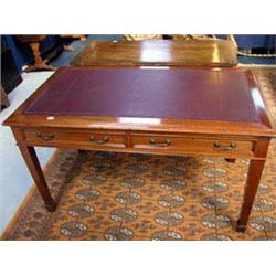 A C1900, Mahogany writing table with red leather inset to top and two drawers under having brass han