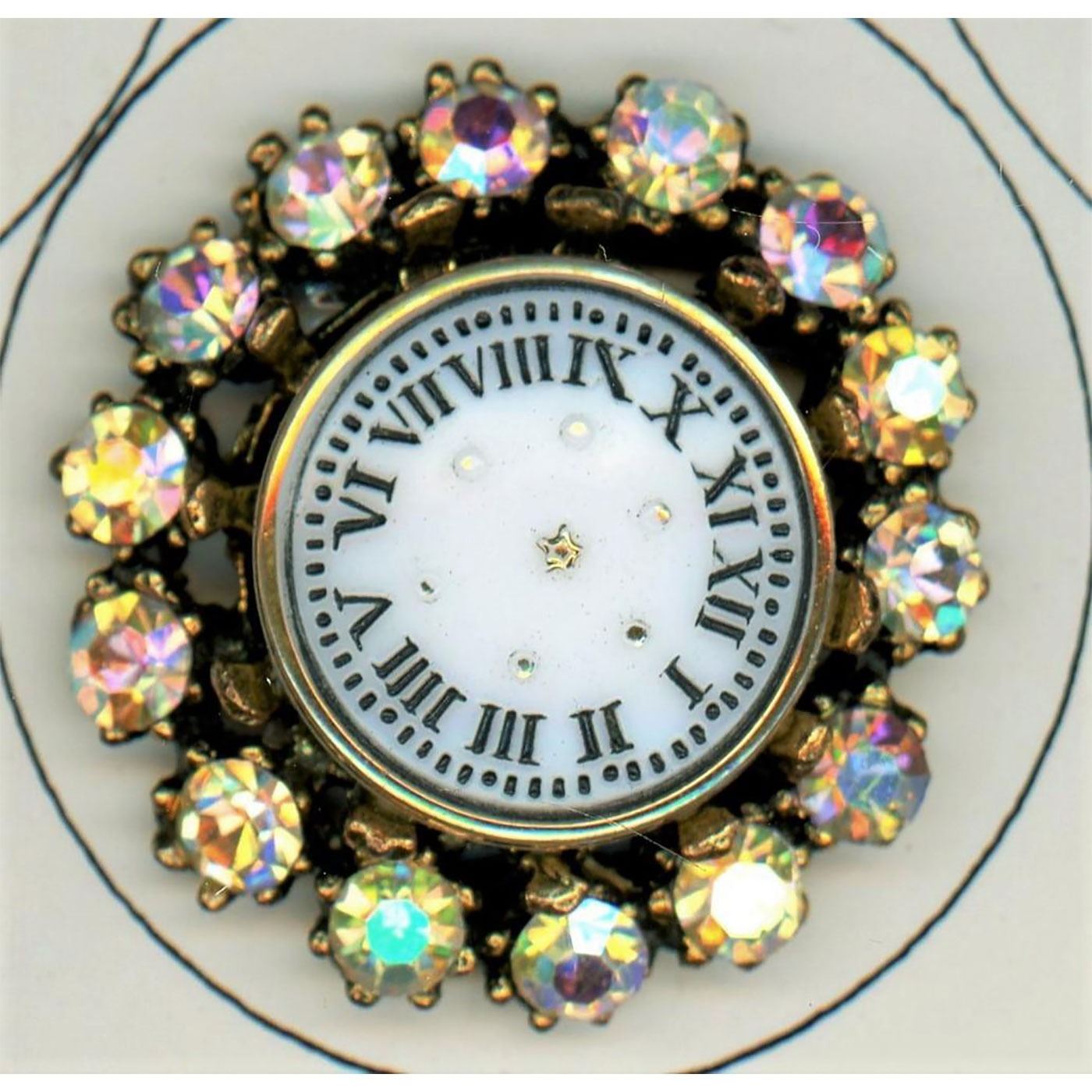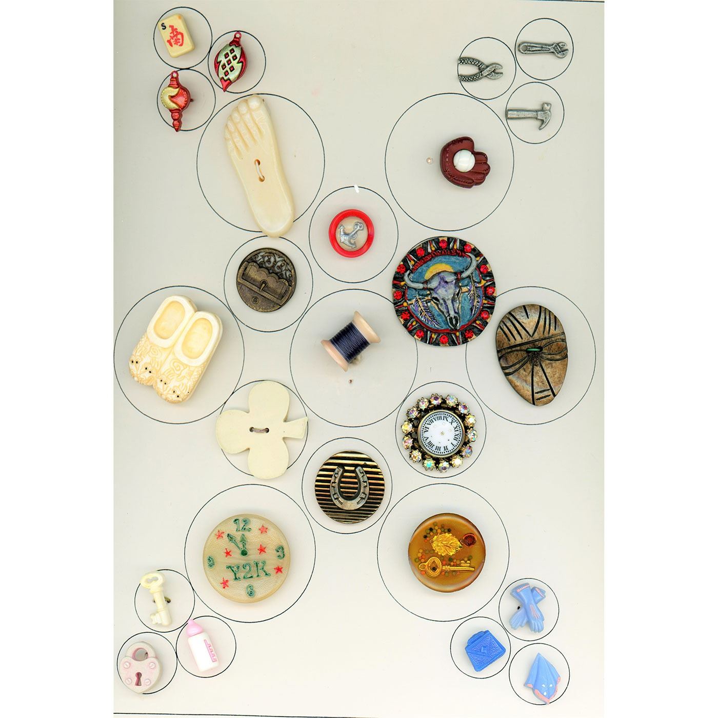 25 Small/Medium/Large assorted material object buttons. This card includes brass, bone, plastic, a VI Y2K clock, a glass and paste clock, a foot, a French Tight horseshoe, and more.