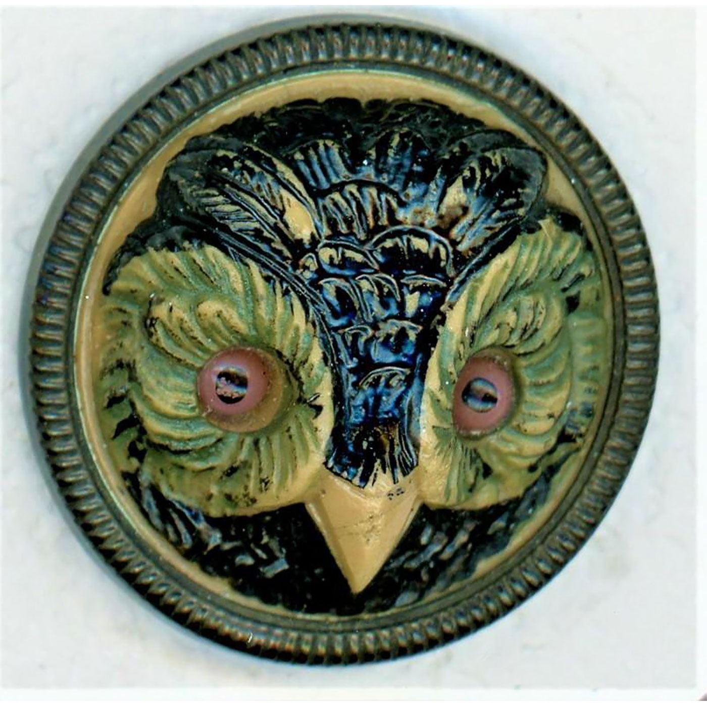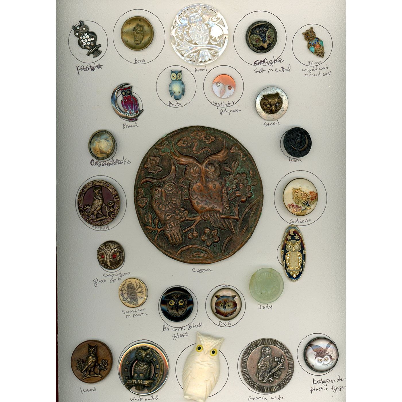 25 S/M/L/Ex L 19th & 20th century assorted material Cat buttons. This full card of owls in assorted materials includes a large pierced Bethlehem pearl, a wonderful Design under glass reverse intaglio, a carmel glass set in metal with glass eyes, a medium Arita porcelain, an extra large Chinese repousse copper, CPE, Satsuma, Pearl, Bone, wood, jade, black glass and more. WOW-WOW-WOW. I cant believe were selling this card all in one lot, what an incredible lot it is, don't you agree?