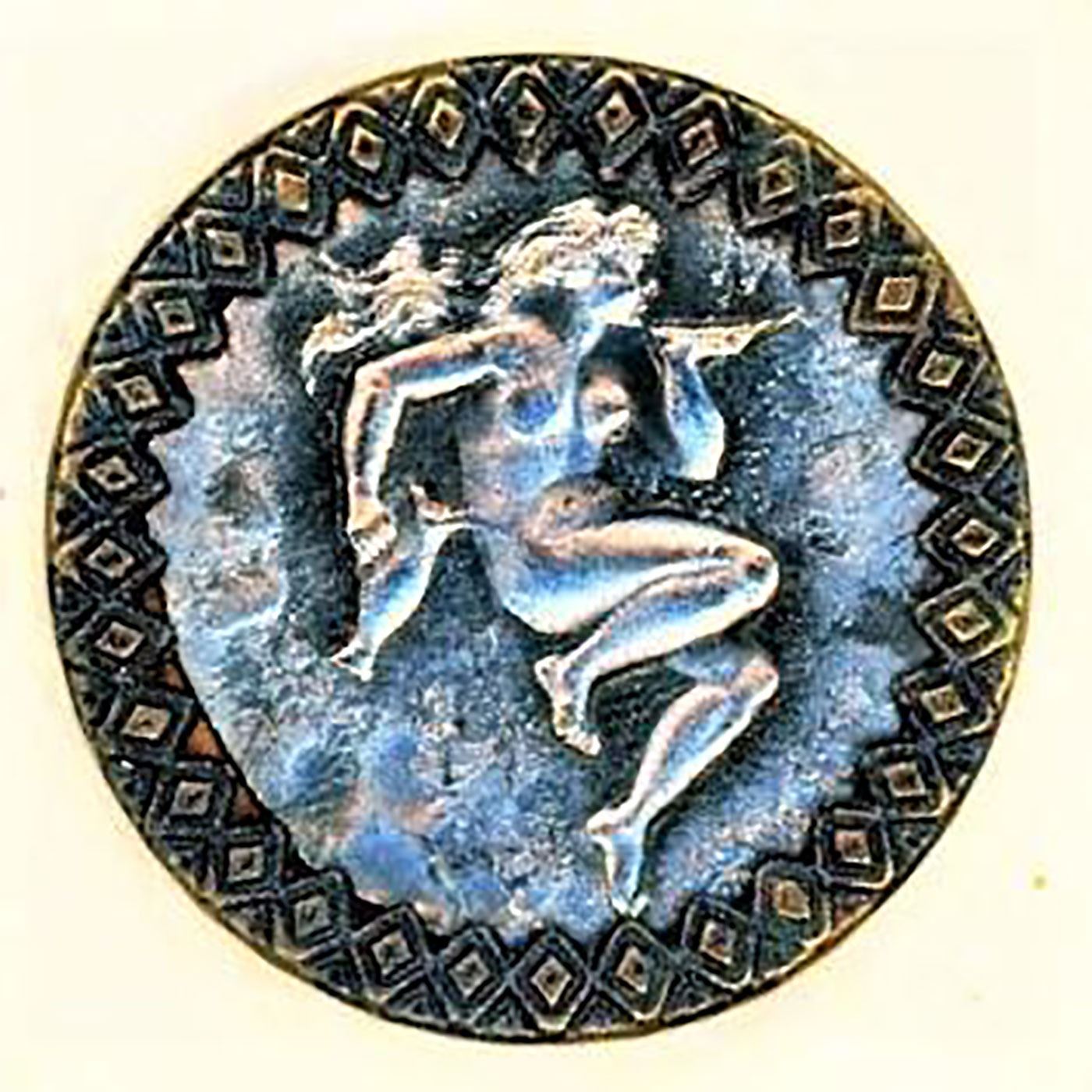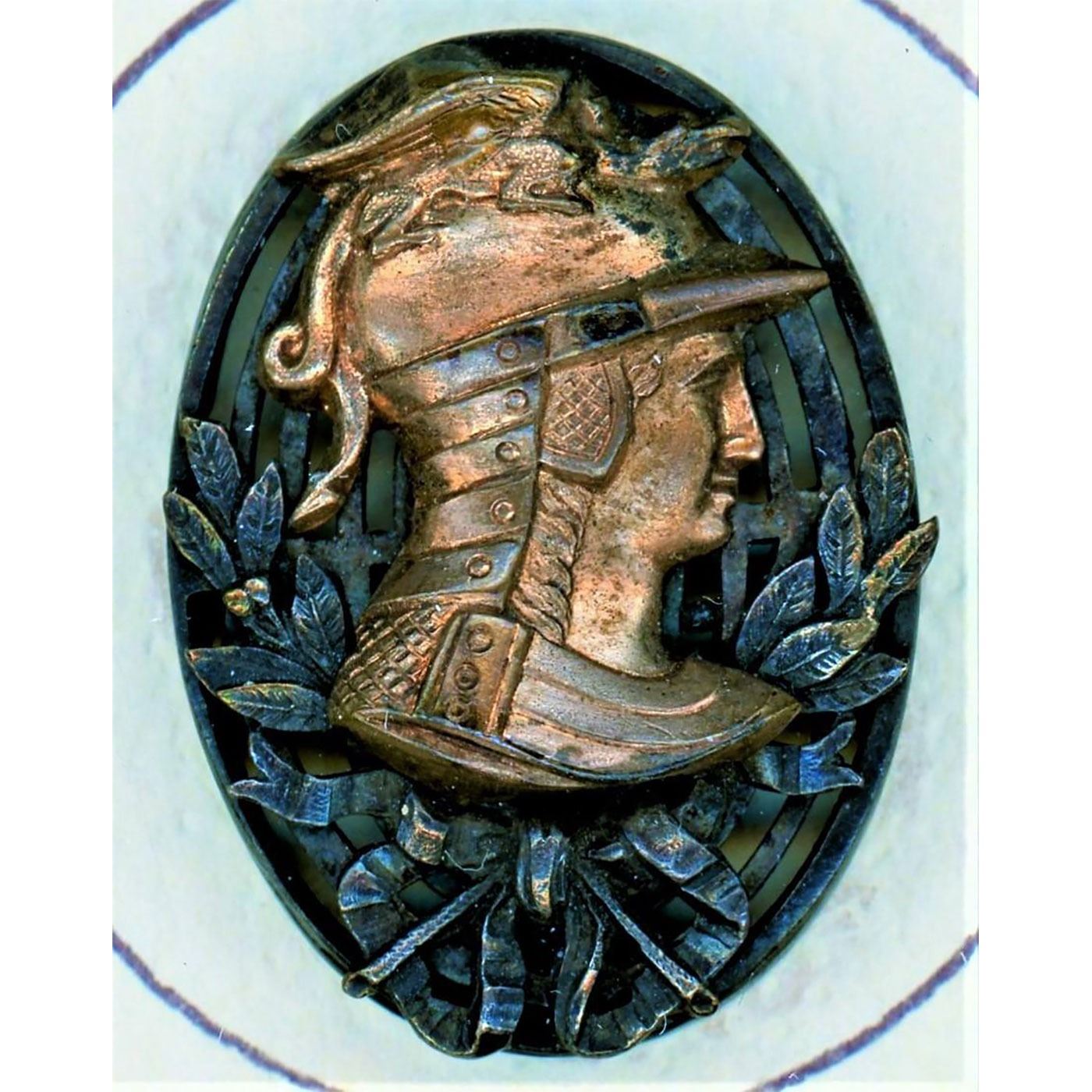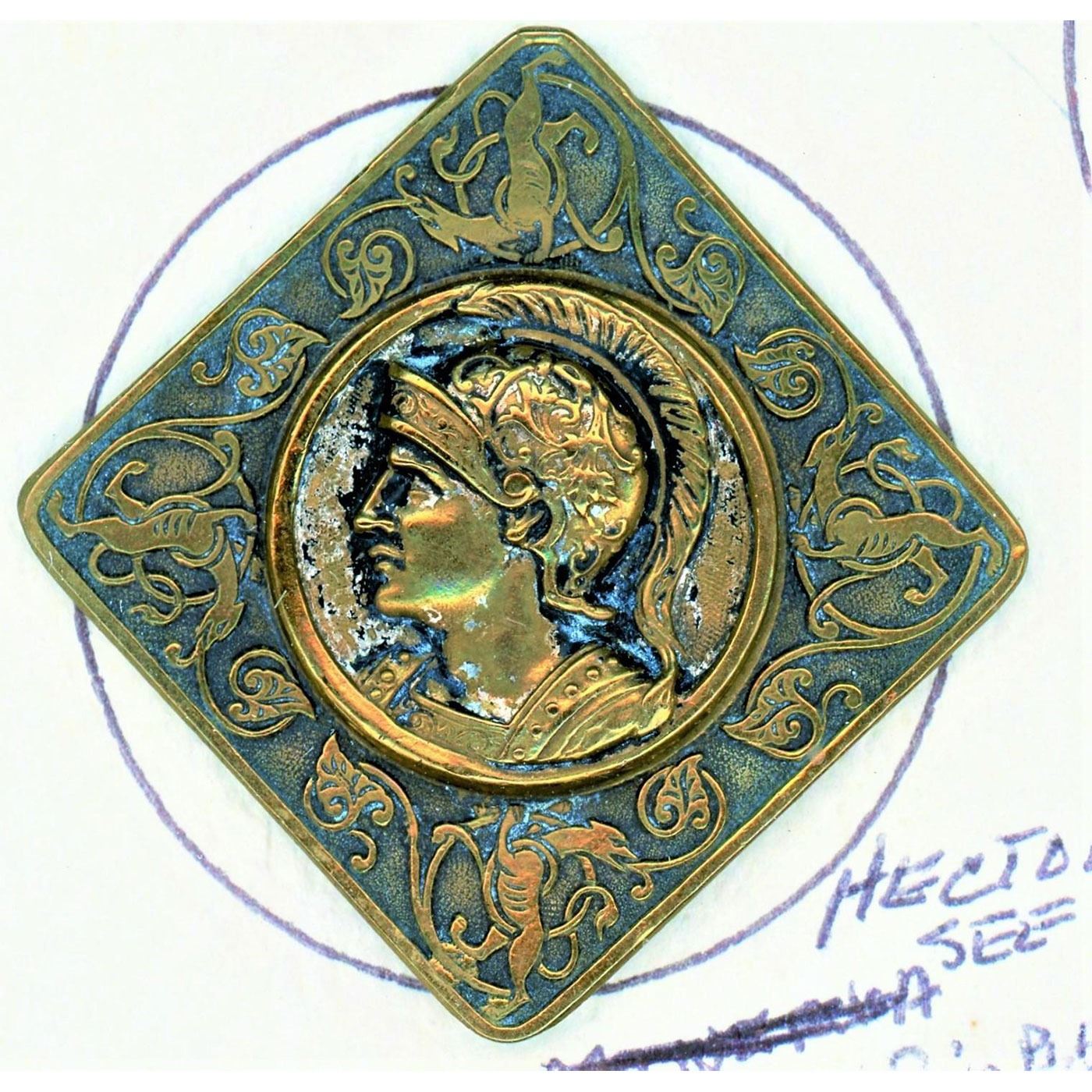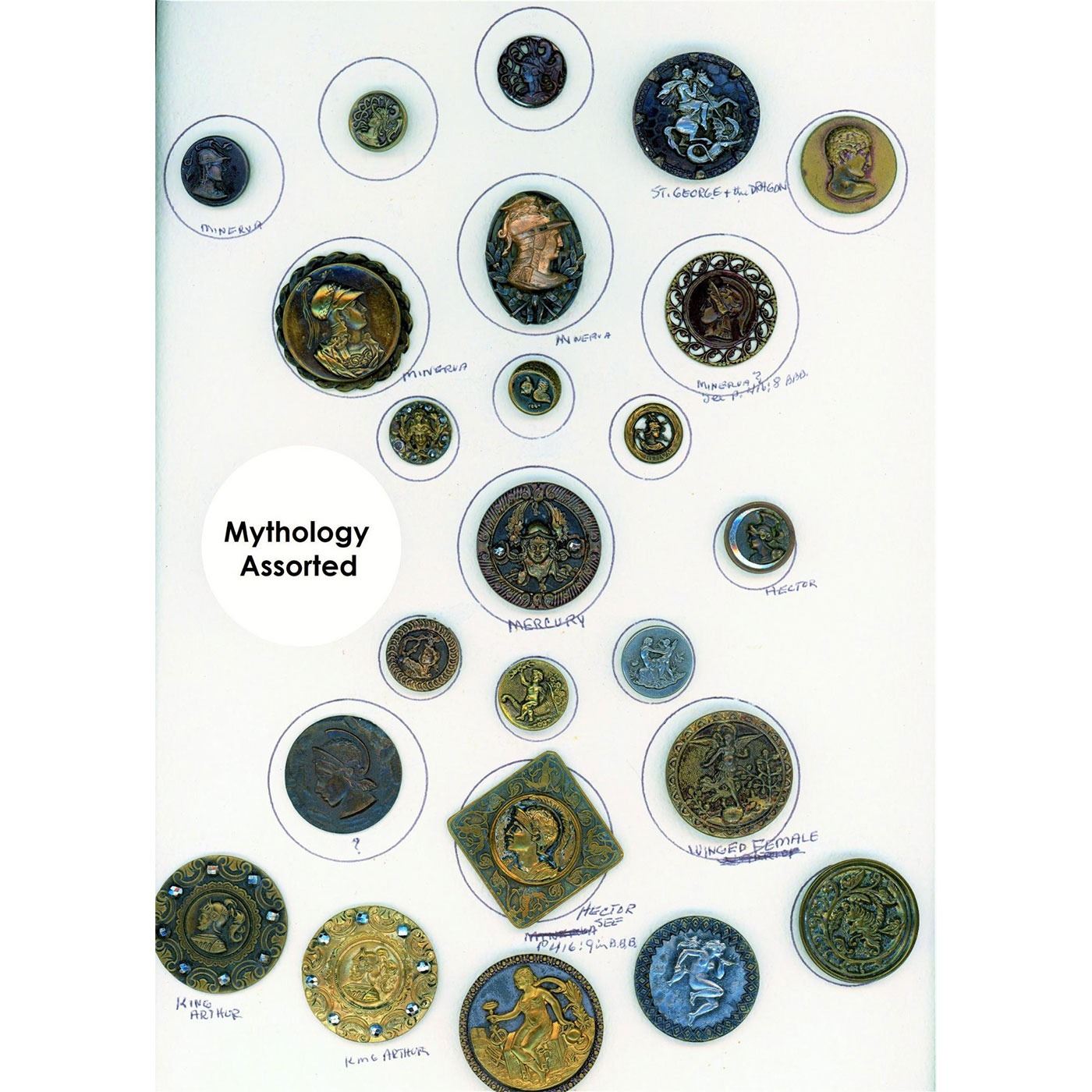 24 Small/Medium/Large assorted metal assorted Mythology buttons. Be sure and look closely to see the variety of Mytho buttons on this card including the really nice oval Minerva, the beautiful silvered brass with brass rim at the bottom right and more.