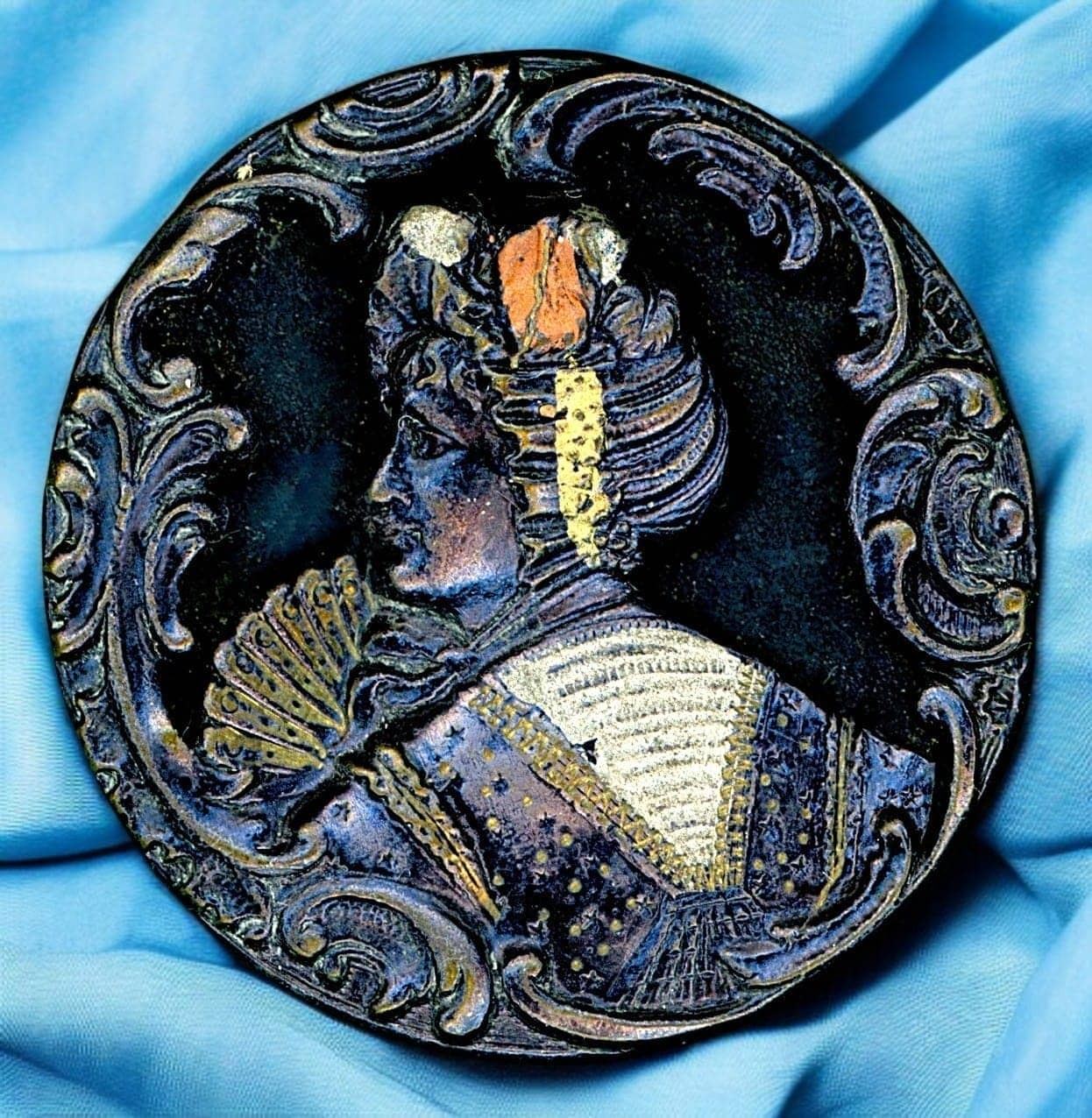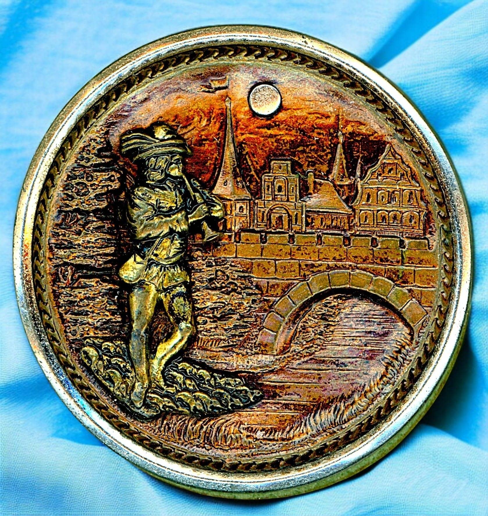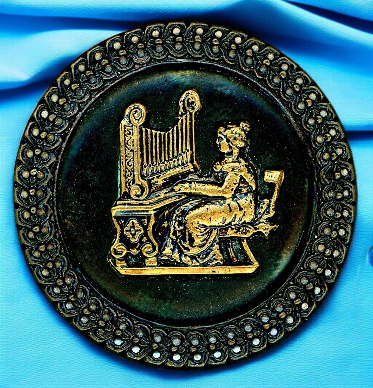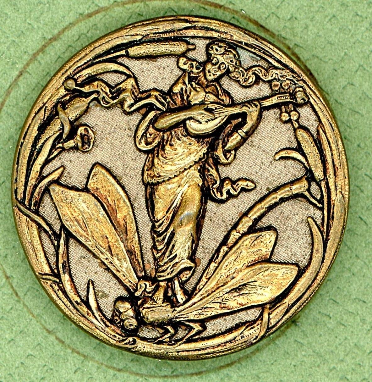 23 S/M/L 19t/20th C. mostly brass including some scarce examples. This nice card includes the Art Nouveau design of the women playing a mandolin and riding a dragonfly, St Cecelia at the Organ, a polychrome enamel of the Nut Tree Boy, and much more including a beautiful tinted lady.