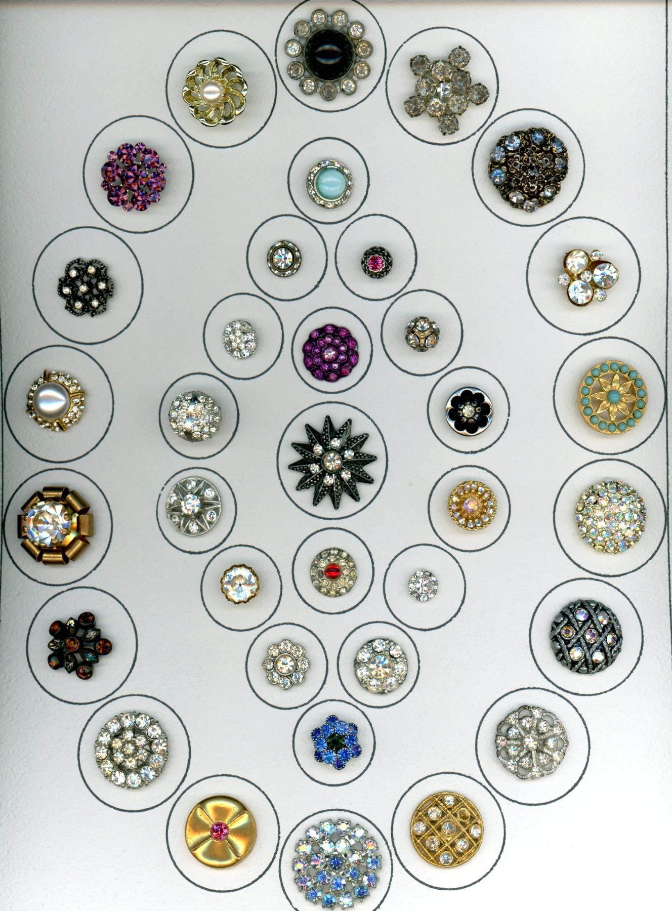 35 S/M/L Mid 20th century colorful paste jewel examples.