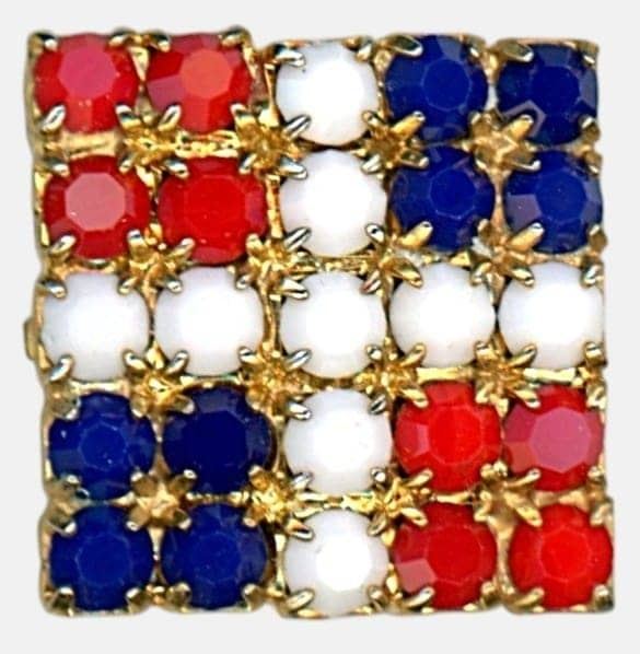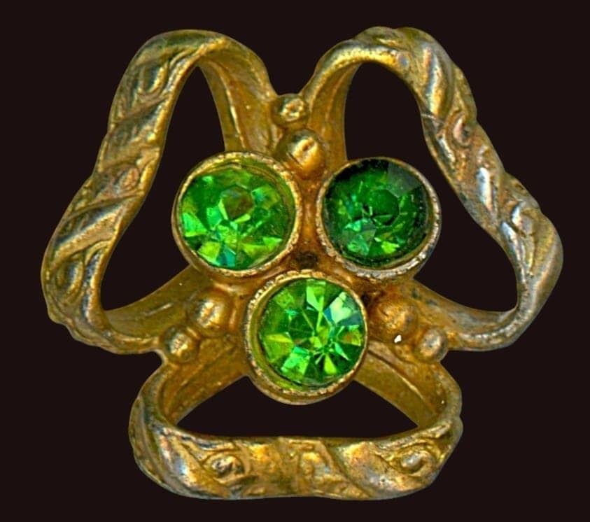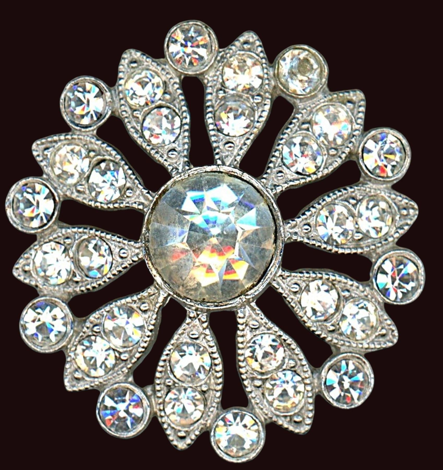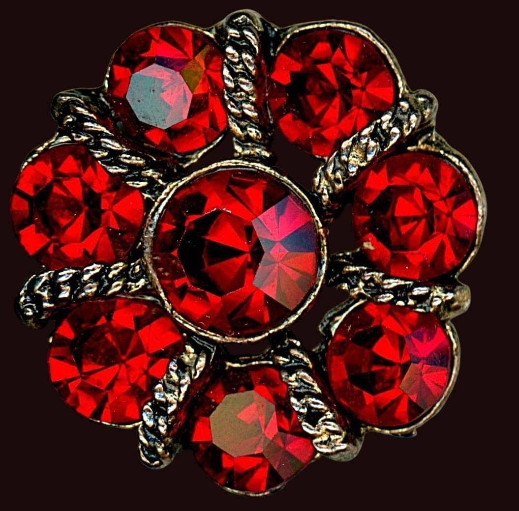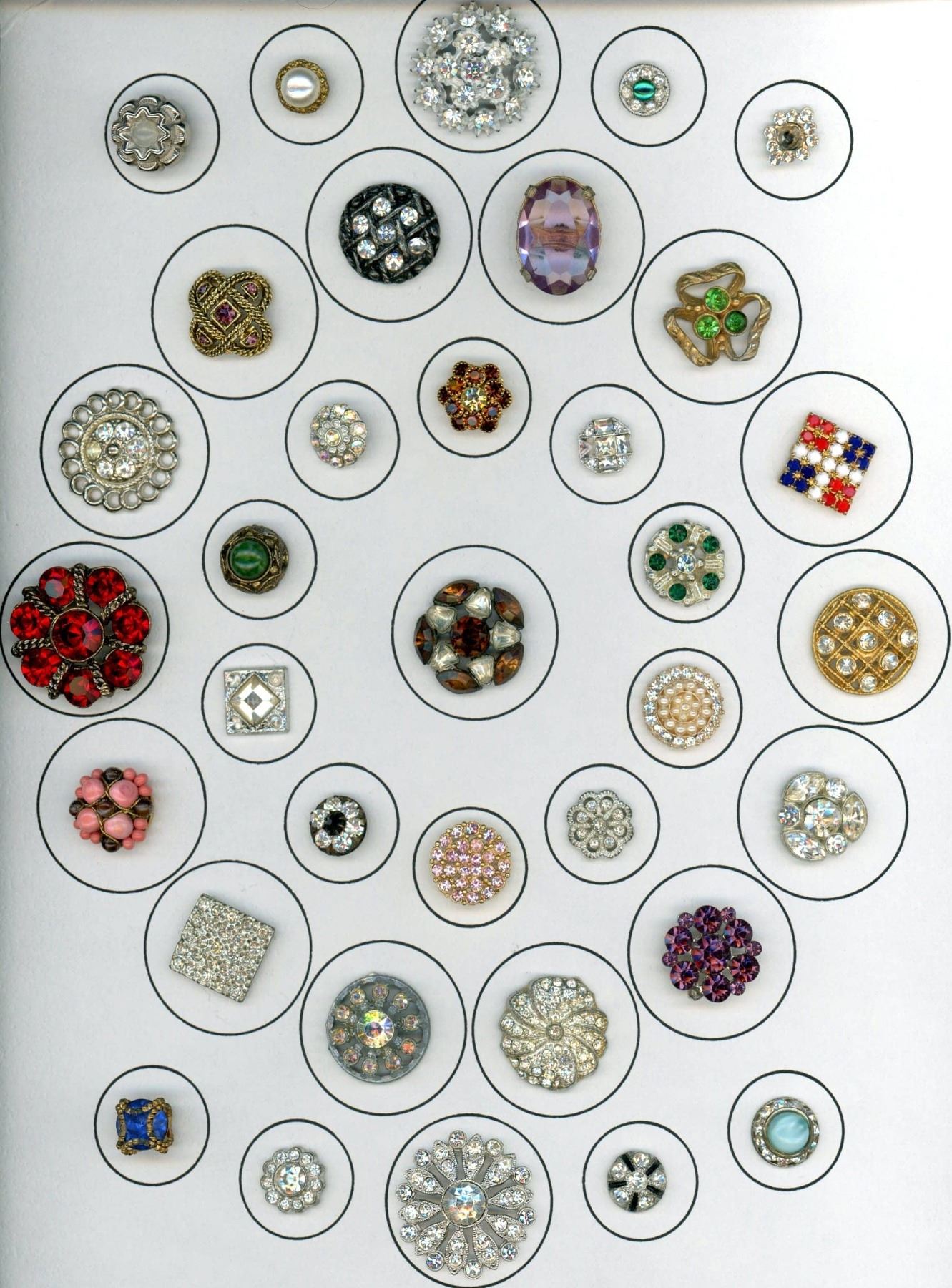35 S/M/L Mid 20th century colorful paste jewel examples. Here is a card of a variety of shapes and clear and or colored glass stones in metal that imitate gemstones. A sparkling array of buttons.