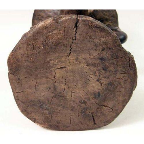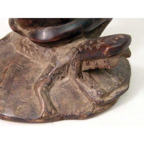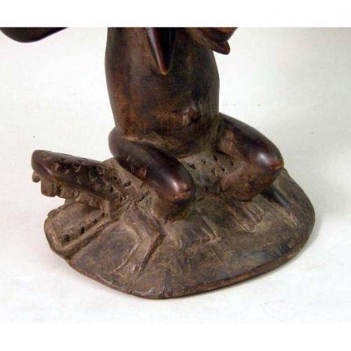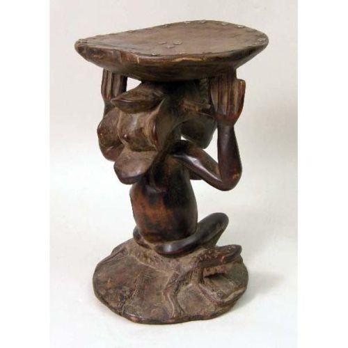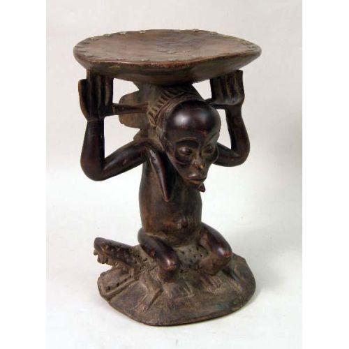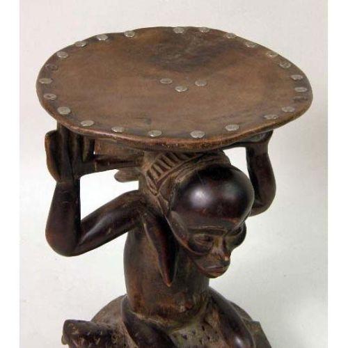 A CARVED AFRICAN AND METAL MOUNTED FIGURAL STOOL<BR><BR>Luba, depicting a woman seated on an alligator, some wear, 13"h x 9"dia.