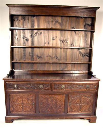 A CARVED AND FIGURED OAK WELSH STEP-BACK CUPBOARD; In two parts, the upper section open and fitted with shelves, the lower section fitted with carved doors and drawers 7'h x 5'9"w x 23 1/2"d