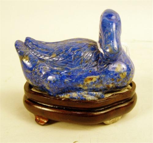 A CARVED BLUE STONE FIGURAL OF DUCK, 3"l on stand