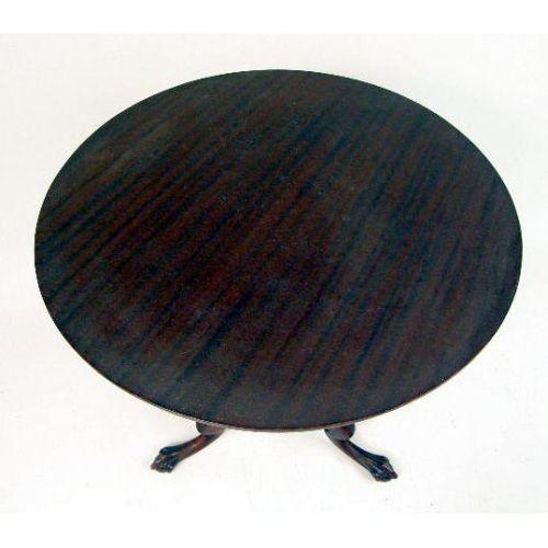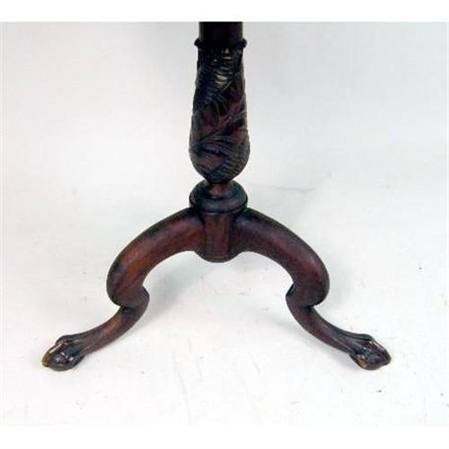 A CARVED CHIPPENDALE-STYLE TEA TABLE<BR><BR>With ball-and-claw feet, the underside with an old label from Karcher & Rehn Co., Philadelphia, 38"h x 28"dia.