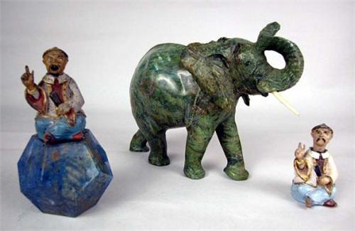 A CARVED GREEN STONE ELEPHANT; signed, Jeffre at base of rear foot, losses, 6"h TOGETHER with two painted metal nodding head Oriental figurines, one on a blue carved stone base, losses