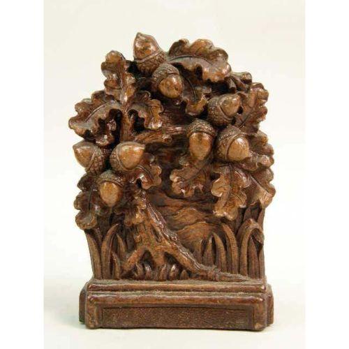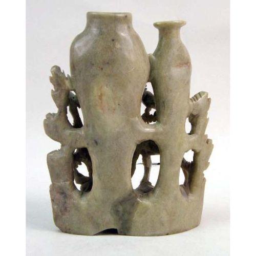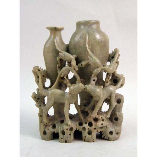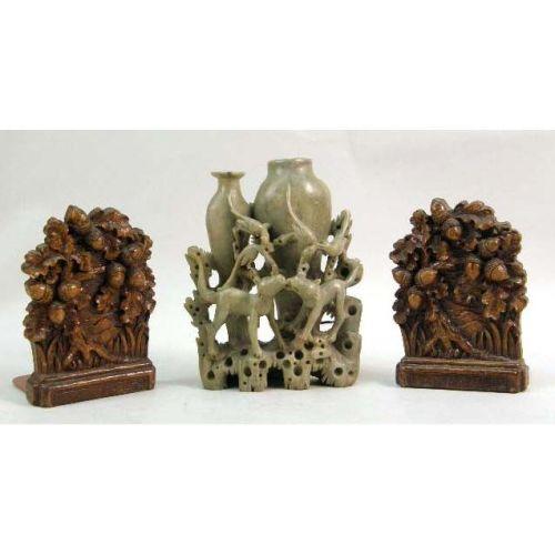 A CARVED HARDSTONE VASE<BR><BR>In a dog and bird motif. Together with a pair of carved bookends in a maple leaf and acorn motif, 8 1/2"h