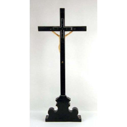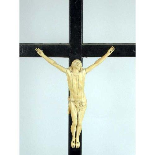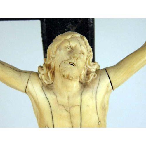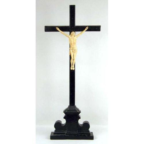 A CARVED IVORY CRUCIFIX ON WOODEN CROSS AND BASE<BR><BR>Ivory, 10"high x 8", base, 32"h x 13"