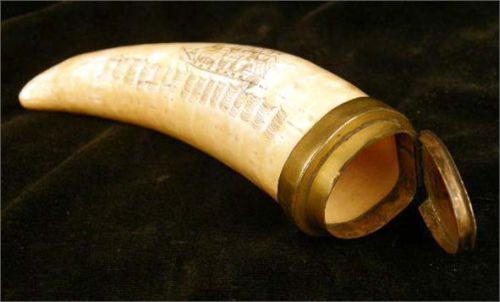 With metal mounted hinged lid, depicting a sailing ship. Together with a carved bone tusk, depicting an Eskimos scene, shrinkage and repainted, 14 1/2"l
