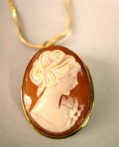 A CARVED SHELL CAMEO PENDANT/BROOCH ON CHAIN;