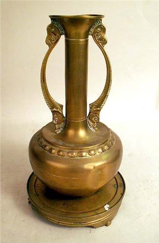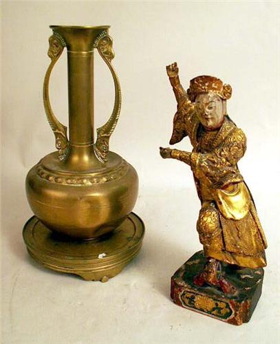 Losses and wear. 10 1/2"h. Together with a brass handled vase marked Tiel, Holland, C&K Co., dented, and an Asian brass circular footed stand. 3 pieces.