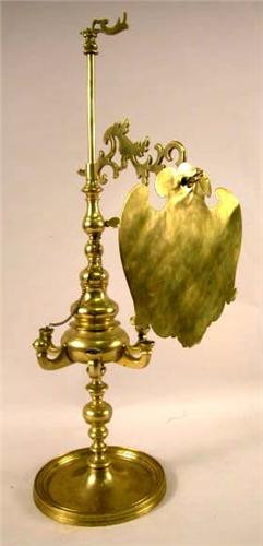 A CAST BRASS SIX LIGHT FLUID LAMP WITH REFLECTING PANEL; With a leaf-form reflecting screen on a shaped and pierced arm, the baluster and reel-form standard with six projecting arms ending on a circular foot (some wear) 25 1/2"h