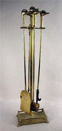 A CAST BRASS WROUGHT IRON DUCK HEAD FIREPLACE STAND AND TOOL SET; Comprising, a shovel, brush, tongs, poker and accompanying stand