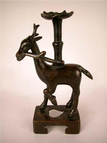 A CAST BRONZE CANDLESTICK, CONTINENTAL; with a figural stag on rectangular base