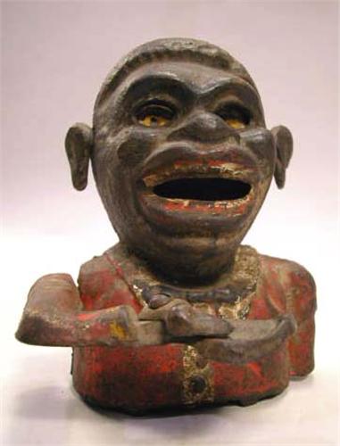 A CAST IRON MECHANICAL BANK; Depicting an African-American man with articulated arm, 6"h