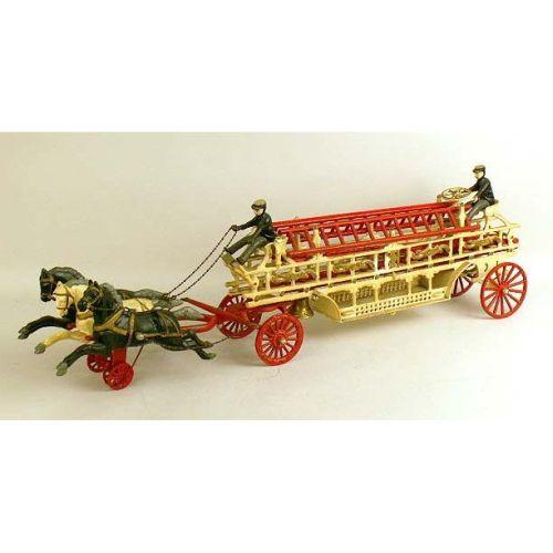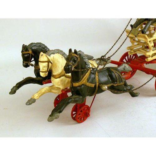 A CAST IRON POLYCHROME-PAINT DECORATED TOY<BR><BR>Of a hook and ladder, with three horses, three detachable ladders, and two people, 9"h x 30"l
